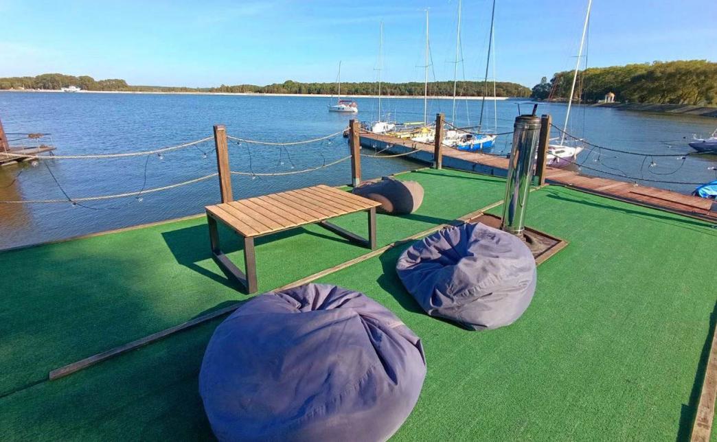 - комната отдыха с видом на Заславское водохранилище, панорамное окно, мягкая мебель, зона отдыха с мангалом, терраса на верхней палубе