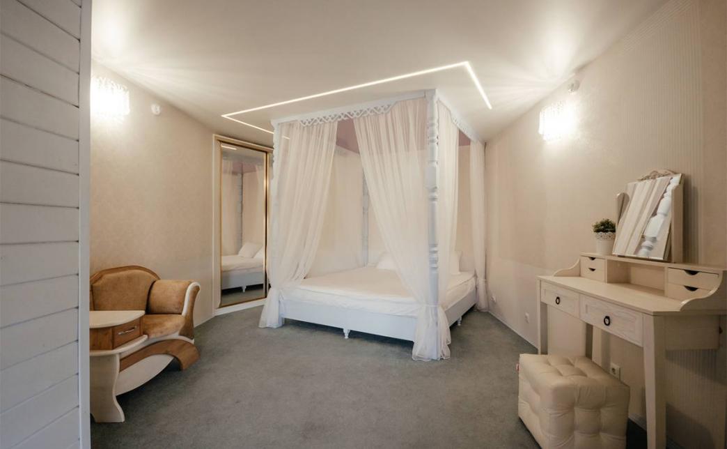 - Оснащение: шкаф-купе, тумба, макияжный столик и пуф, ковровое покрытие