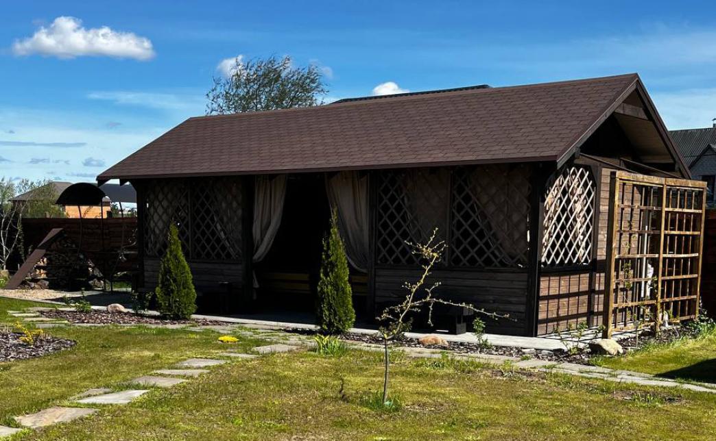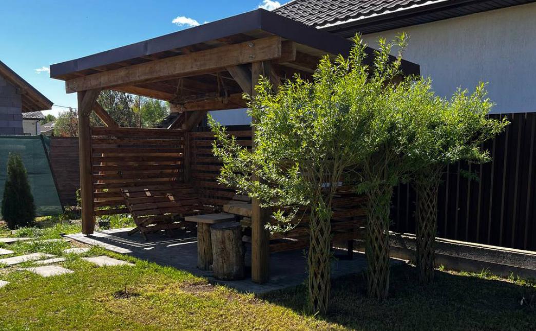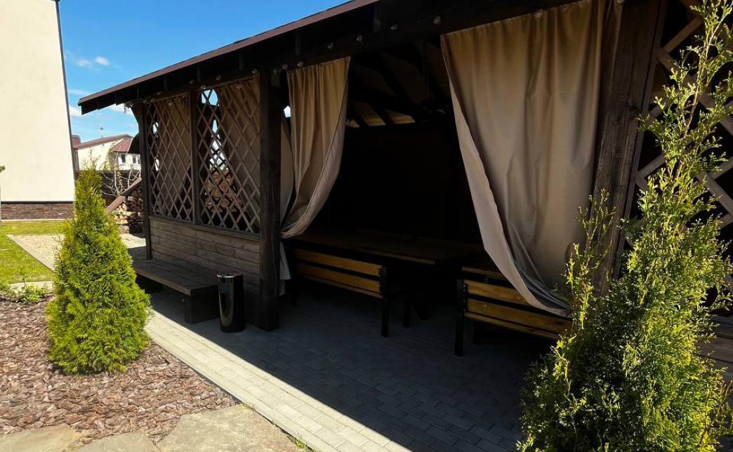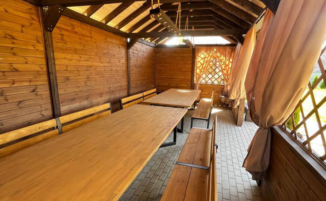 Открытая беседка максимальной вместимостью до 30 человек. Закрытая беседка с кухней и барной стойкой вместимостью до 12 человек. Собственная парковка на 6 машин. Огороженная территория. Возможность организации питания (шеф-повар, кейтеринг).
