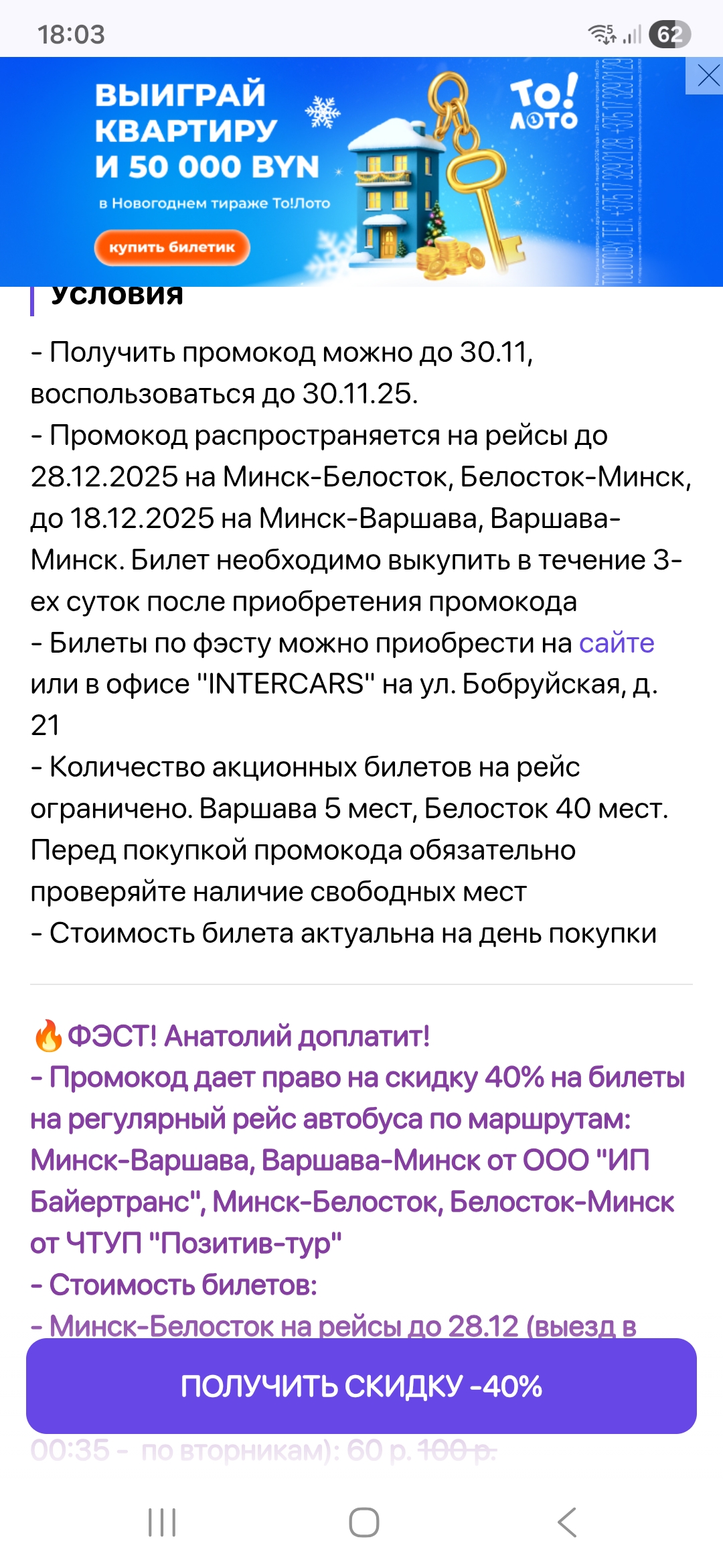 - Промокод дает право на скидку 40% на билеты на регулярный рейс автобуса по маршрутам: Минск-Варшава, Варшава-Минск от ООО "ИП Байертранс", Минск-Белосток, Белосток-Минск от ЧТУП "Позитив-тур"