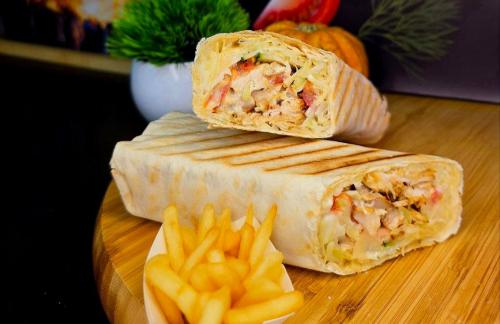 Состав: горчичный соус, курица, картофель фри, морковка по-корейски, свежие огурцы, томат, лук