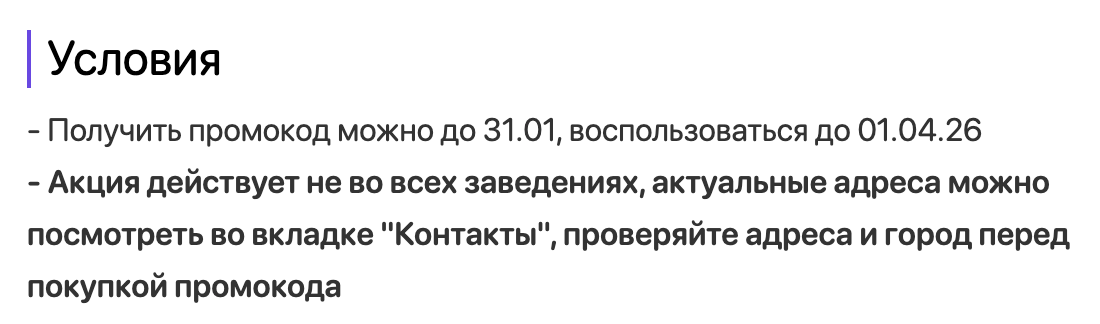 Добрый день! Акция действует не во всех точках, что указано в начале условий акции и выделено жирным начертанием текста. Актуальные адреса, где действует акция, можно посмотреть во вкладке "Контакты" в акции. Также прилагаем скриншот пометки