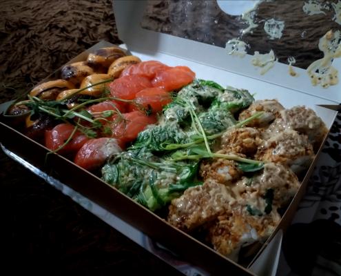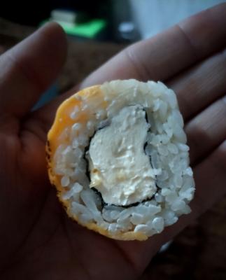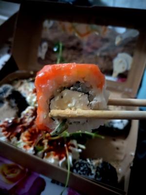 Очень-очень вкусно 🙂 Суши свежие, ооооочень много начинки) мы съели половину сета и объелись) риса не чувствуется, только сыр и рыбу) Курьер приехал даже немного раньше по времени)