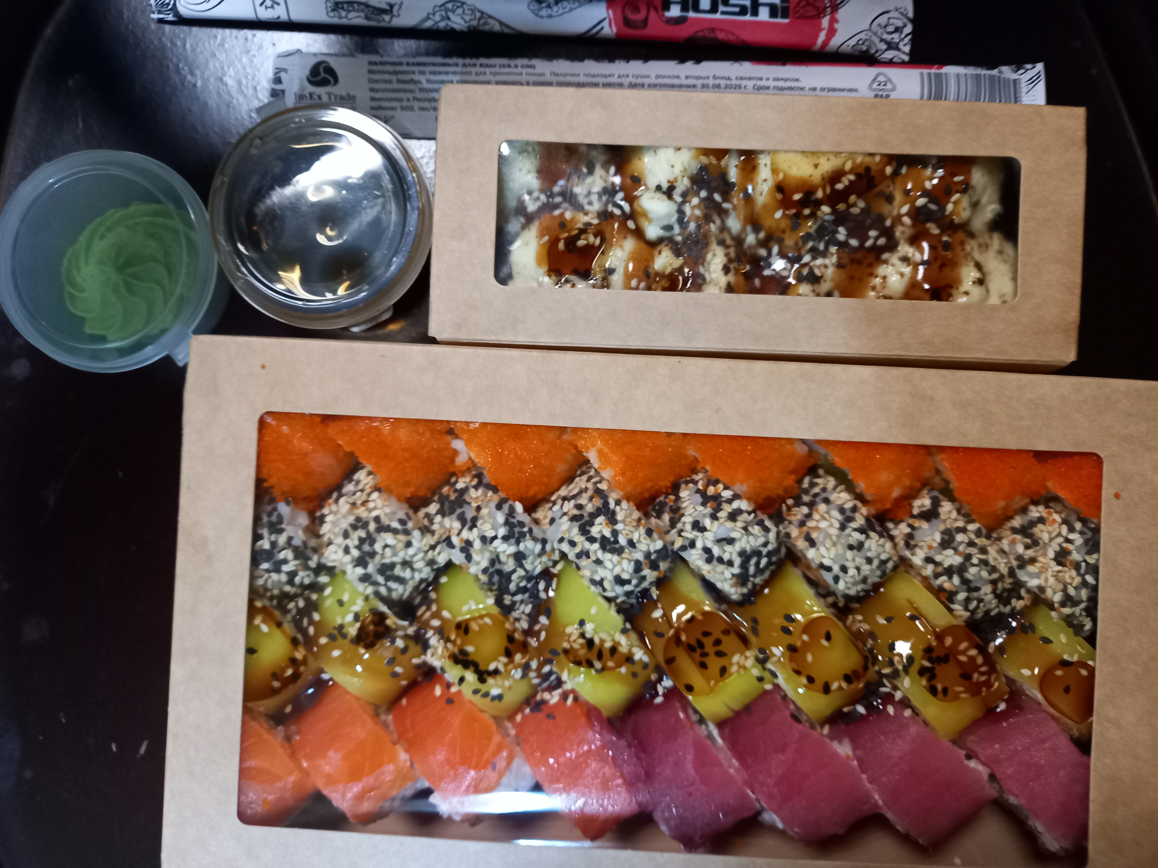 Заказывали бокс с пиццей и роллами и сет Осенний. БЫл сбой - не дошел заказ с приложения, но мы перезвонили и все оформили быстро, вежливо по телефону. Привезли слава богу все вовремя, ровно как просили, бокс классный, там не обычные роллы,, а хрустящие зажаренные, пицца отличная - все оч понравилось! Сет Класс- большой в красивых коробочках, очень все свежее и вкусно пахнет, 1 баночка соевого и васаби, палочки и салфетки положили бесплатно, это радует) В итоге - все наелись, все оч красиво вкусно и достойно, однозначно обратимся еще!