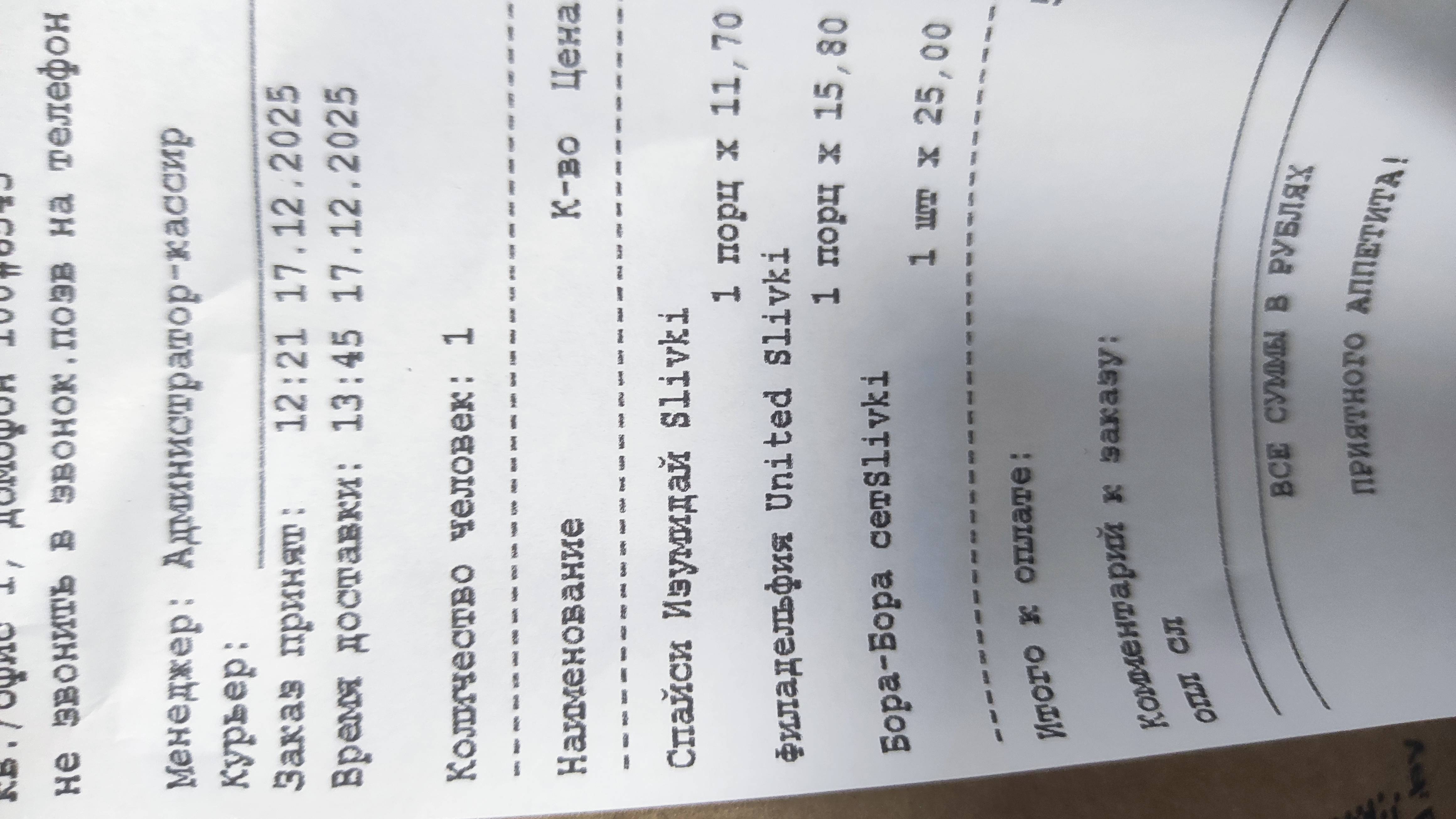 Минус звезда за то,что курьер не читает комментарий к заказу(кроме кода от домофона) ,ну, или оператор ему не сделал акцент. Просила не звонить в звонок, в итоге курьер сначала дважды позвонил в звонок,чем разбудил ребенка, а только потом позвонил на телефон...Ну,спасибо. Не было времени что-то объяснять курьеру,просто забрала заказ и побежала успокаивать плачущего ребенка.