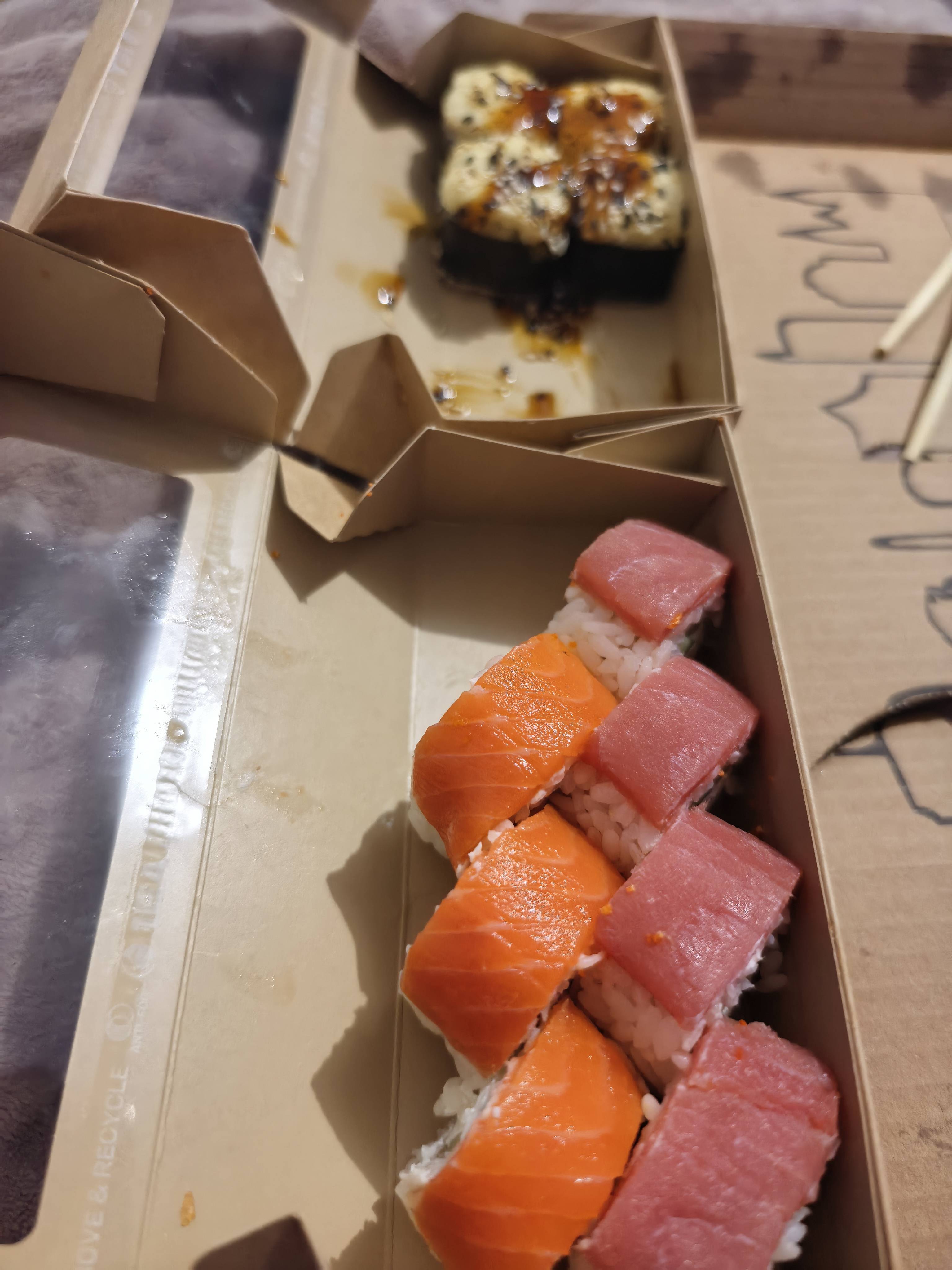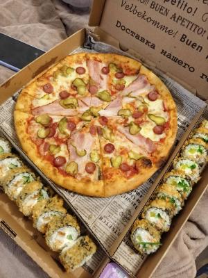 Обалдеть- уже привезли заказ! Брали набор движ и боксы с суши , все такое аккуратное, горячее, палочки салфеточки все дела) запах офигенный, пиццы очень красивые, рекомендуем , из боксов больше всего понравился “kings man” где на пицце сверху соус