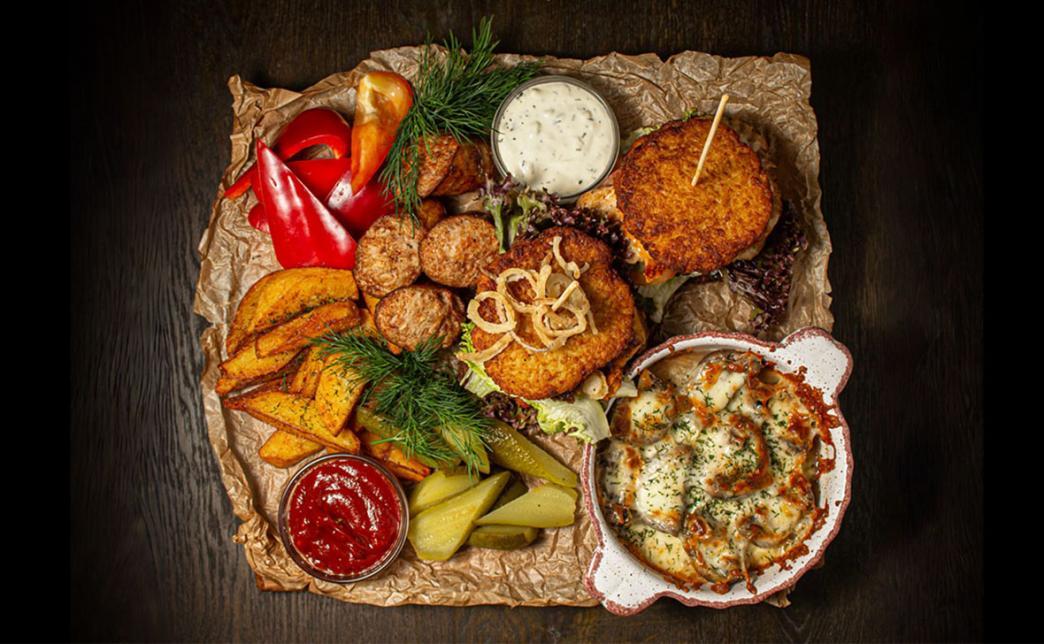 - "Дран Драныч" со свининой (330 г): драники, шея свиная маринованная, сыр, листья салата, огурцы маринованные, томат, соус барбекю