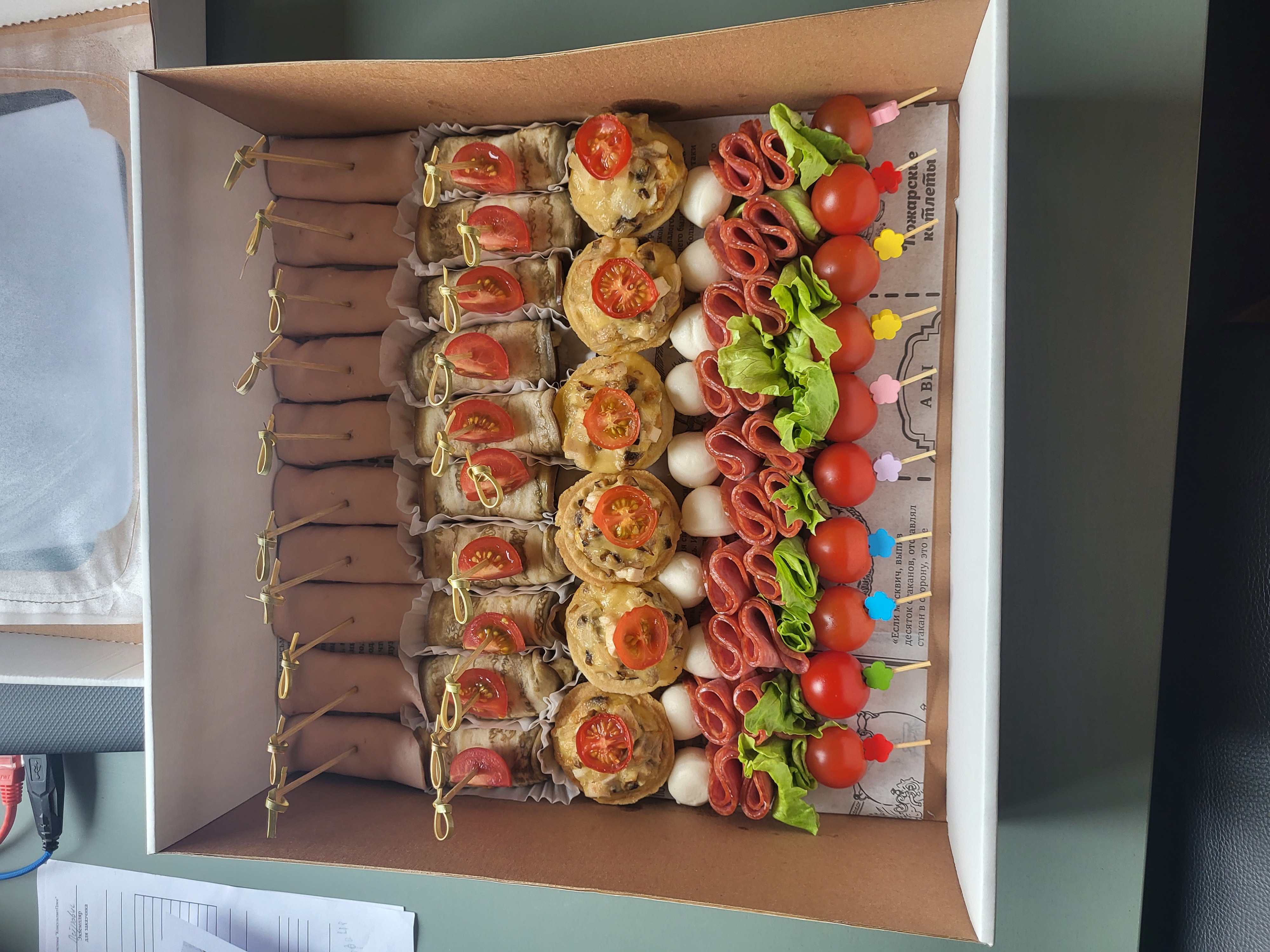 - фудбокс "Канапе": мини-сэндвич с ветчиной, томатом, твердым сыром, салатом, соусом, канапе из томата черри, салями, салата, сыра моцарелла, маслины, канапе из копченого сырного шарика, маслины, с/к колбасы - 30 шт.