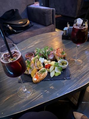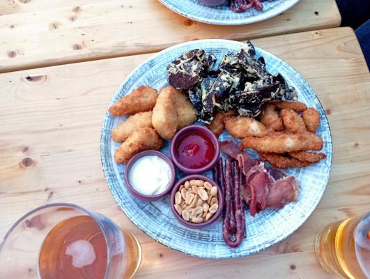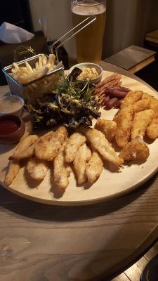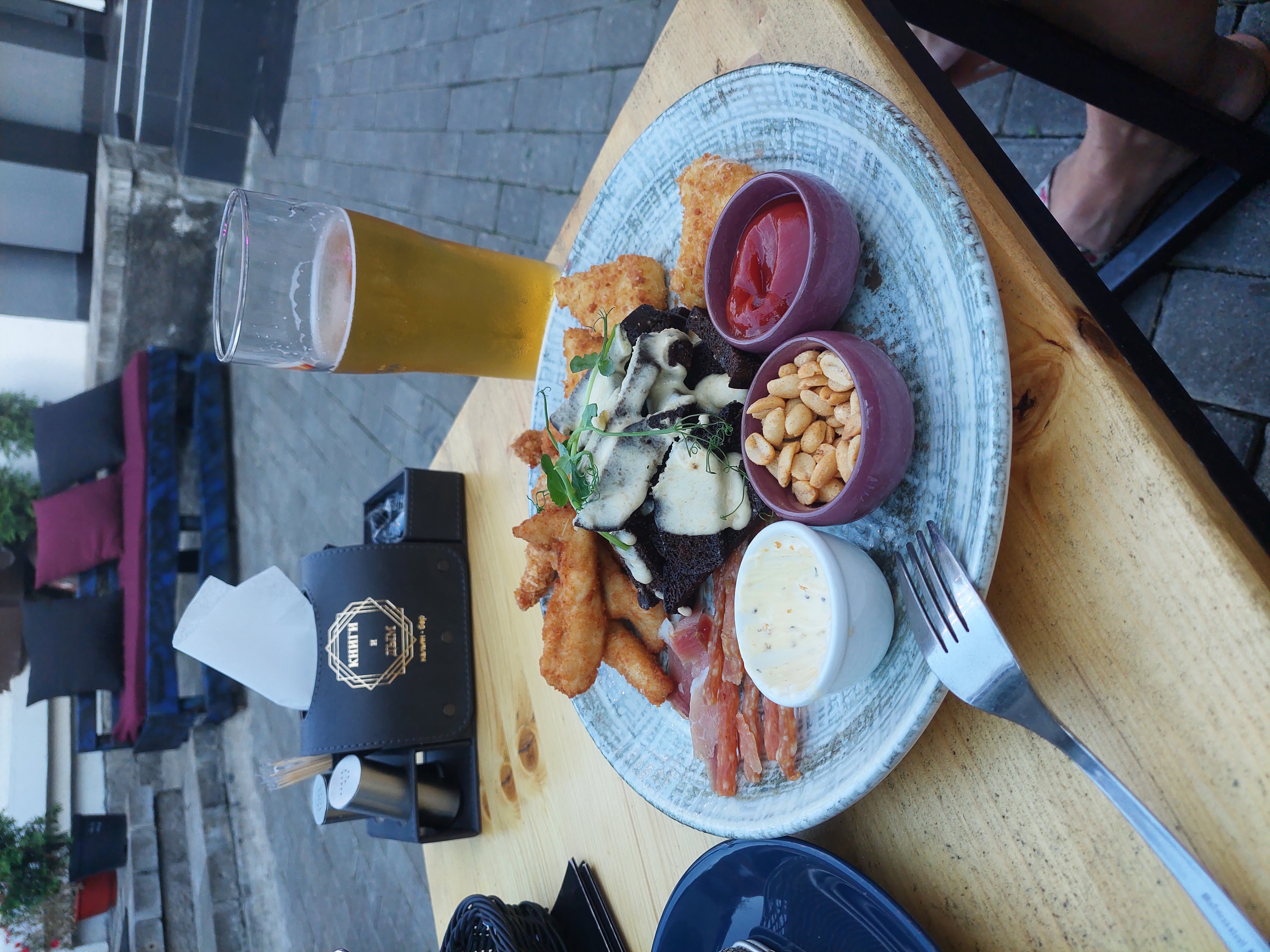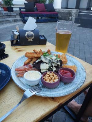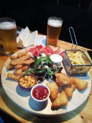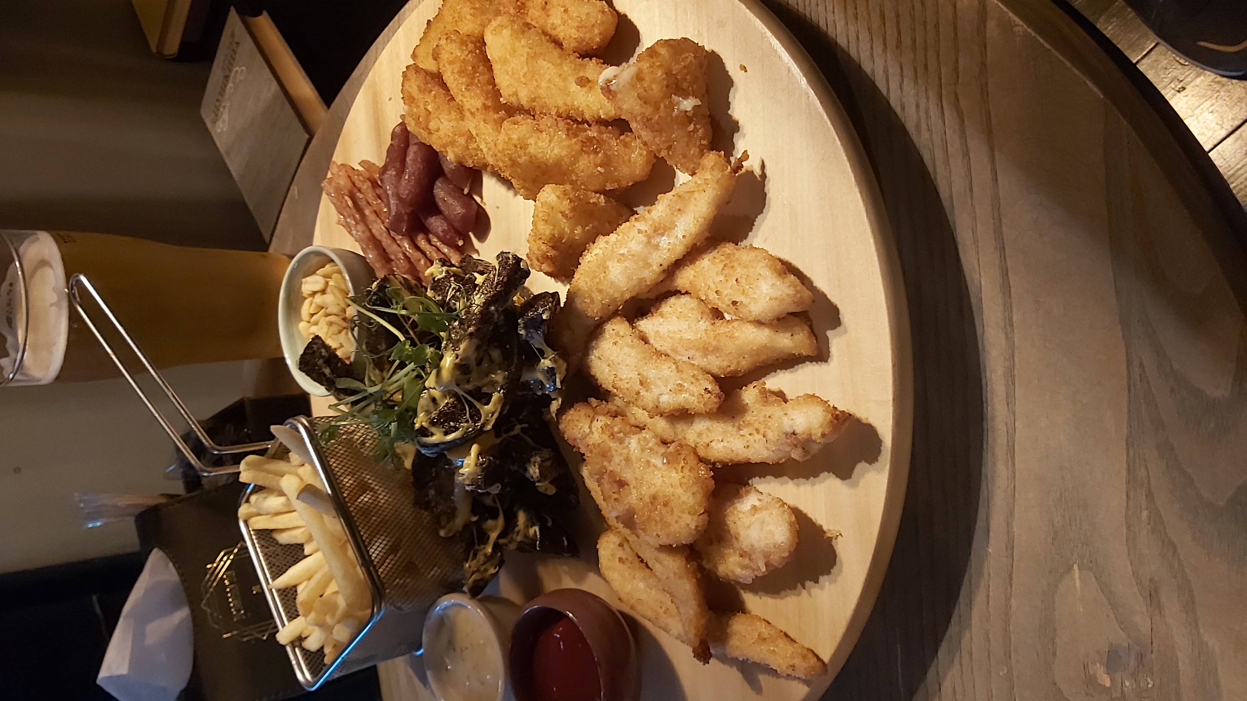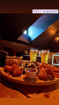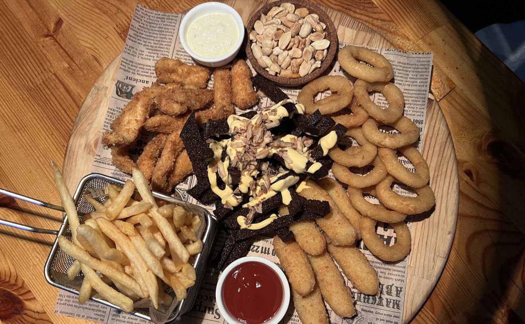 Состав сета: картофель фри, наггетсы, луковые кольца, сырные палочки, гренки с сырным соусом, арахис, тар-тар, кетчуп