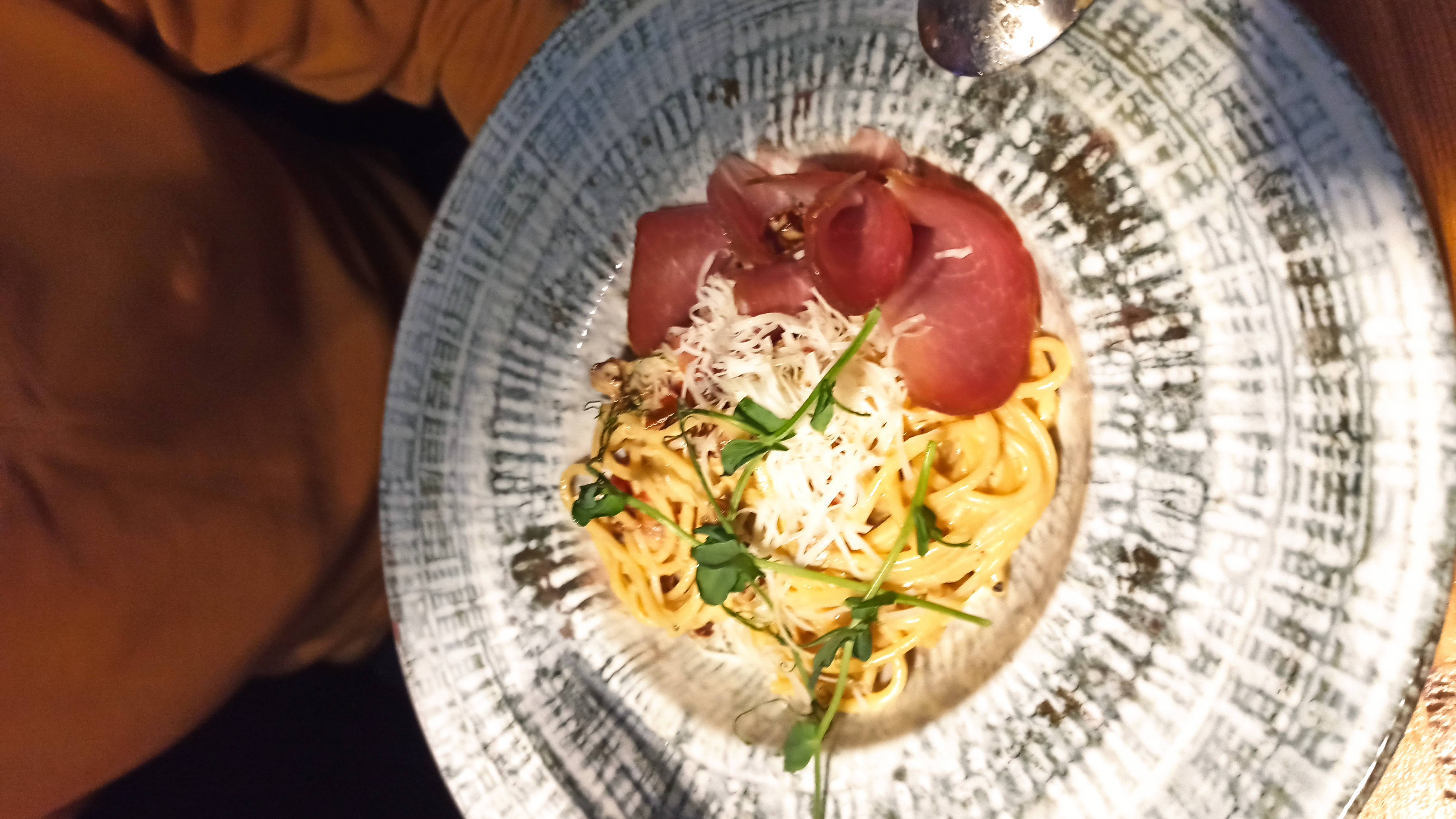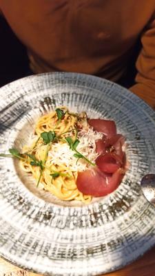 - паста карбонара: спагетти, бекон с/к, сливки, желток, пармезан (300 г)