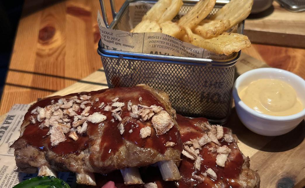 - свиные ребра с пряным картофелем: ребра свиные, вишневый bbq, пряный картофель, соус горчичный, лук маринованный, огурцы кимчи (360 г)