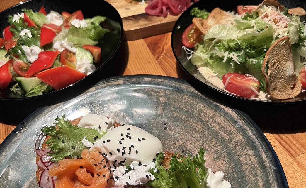 - салат с семгой, творожным муссом и овощами: айсберг, руккола, семга с/с, творожный мусс, огурец, черри, салатная заправка (180 г)