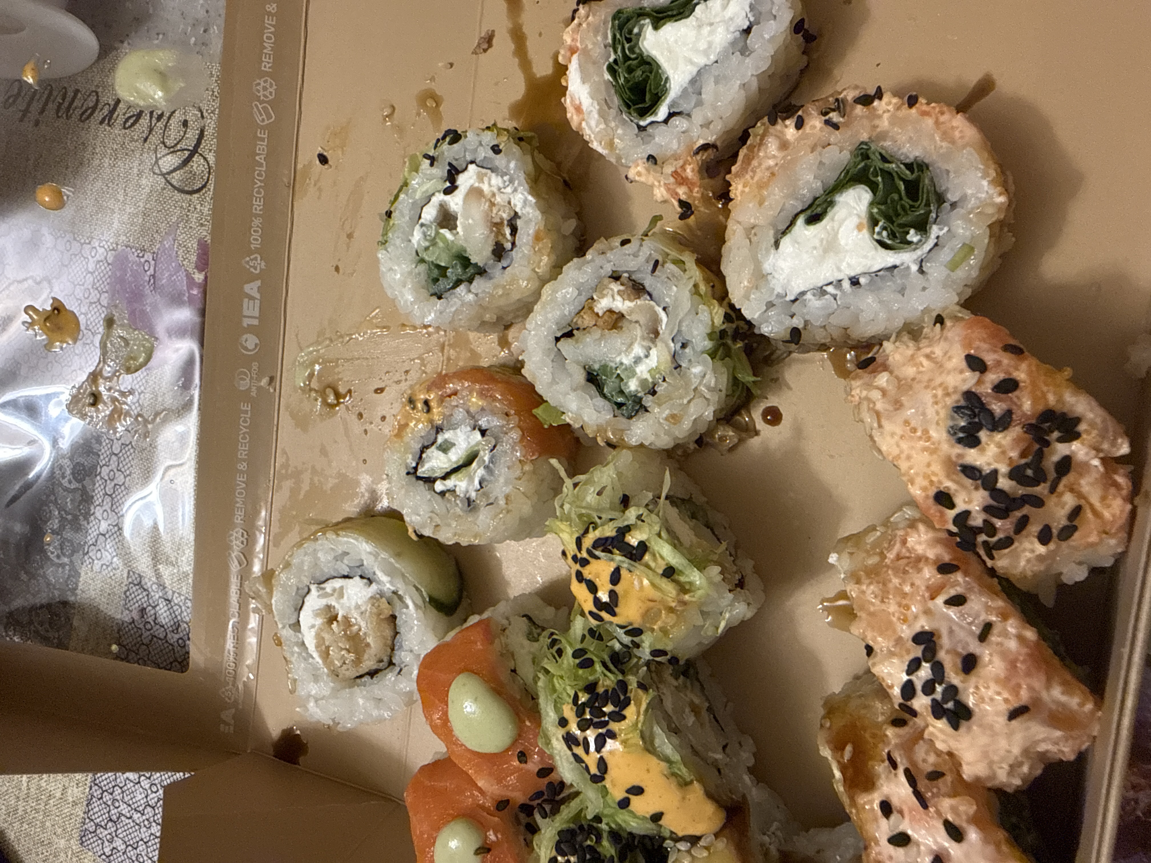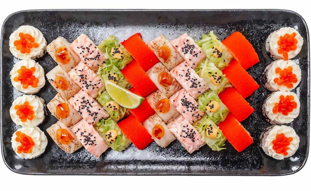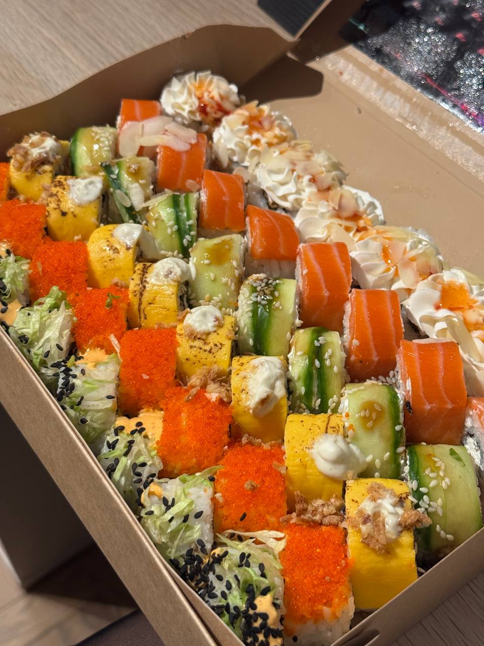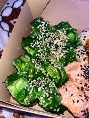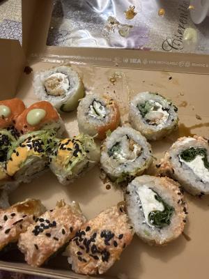 Состав: лосось, огурец, сливочный сыр, соус спайси, кунжут кимчи, соус терияки, кляр, сухари панко