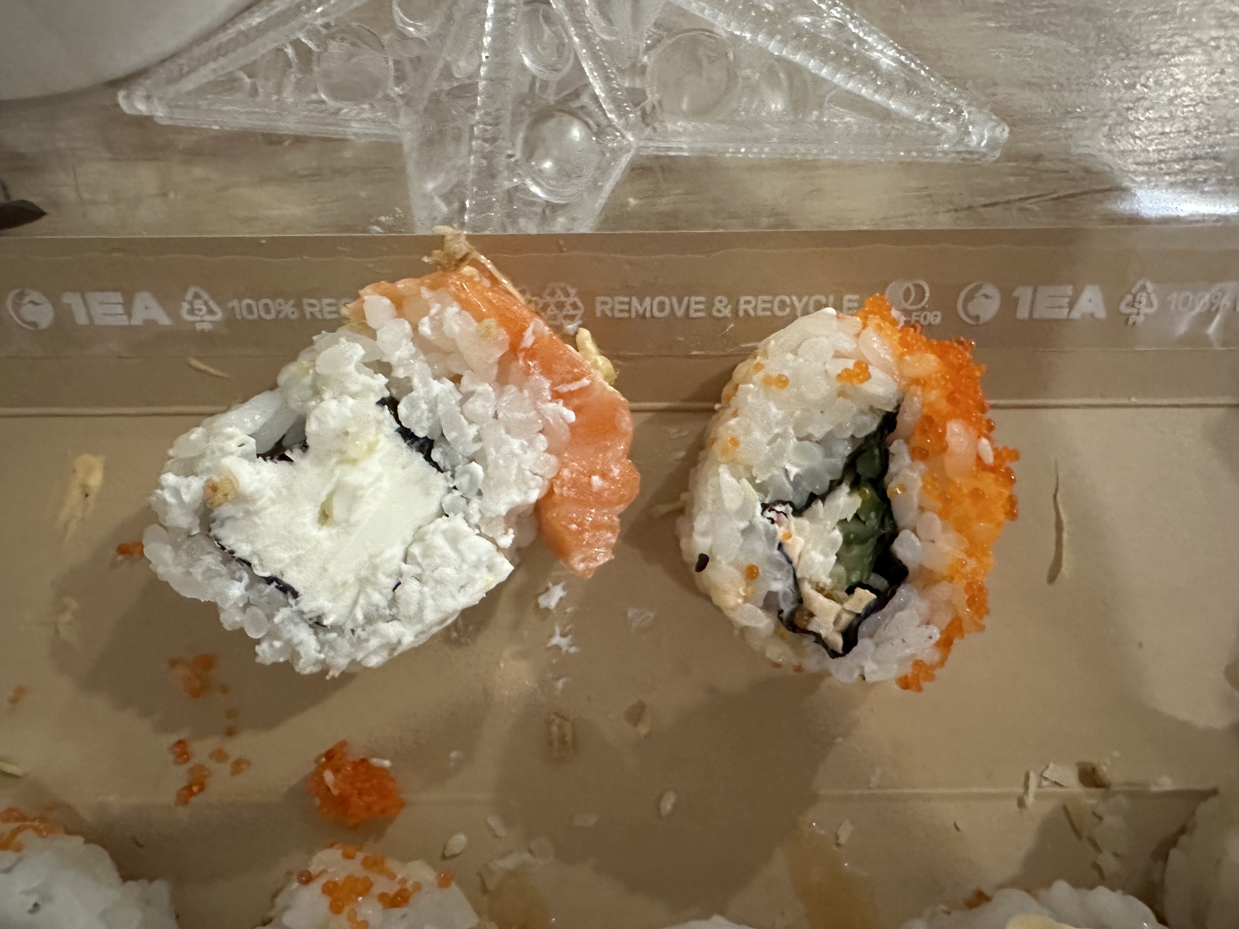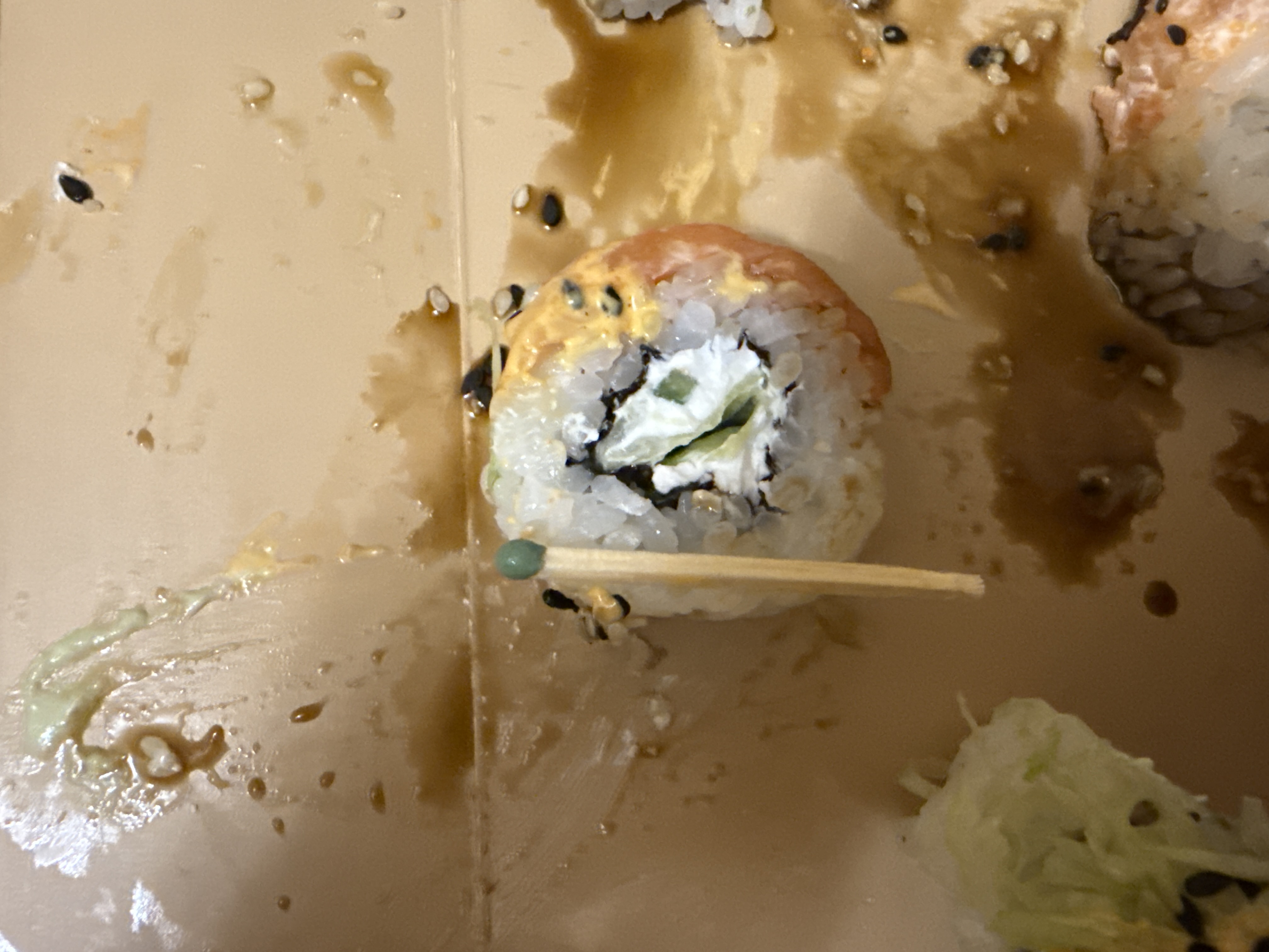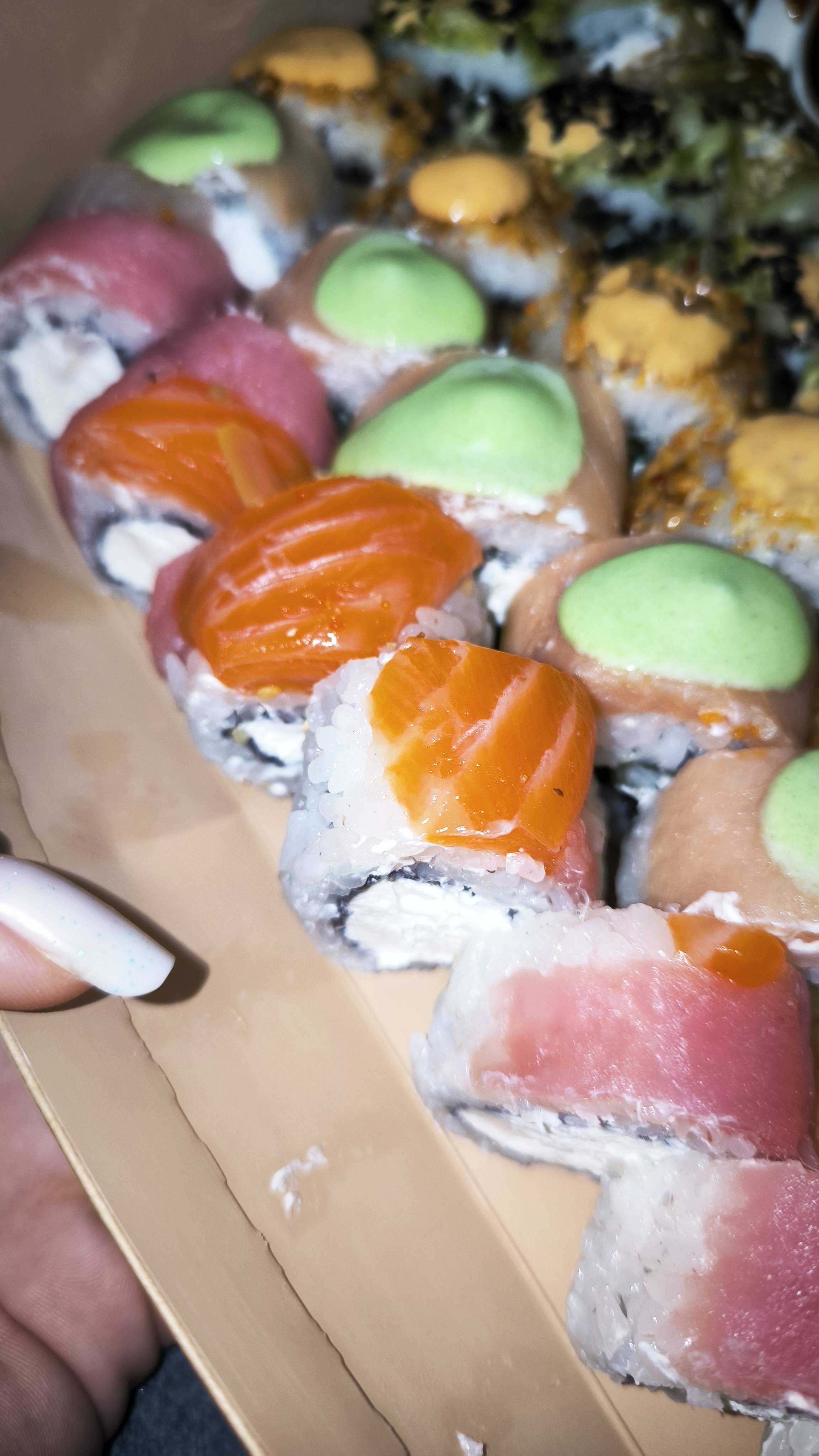 Состав: лосось, огурец, сливочный сыр, соус спайси, кунжут кимчи, соус терияки, кляр, сухари панко