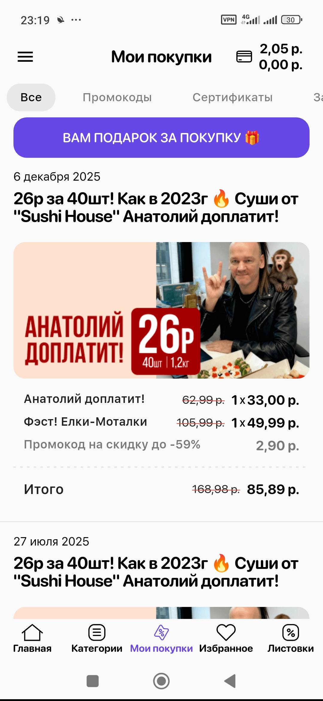 - Промокод дает право на скидку до 59% на сет "Анатолий доплатит" от "SUSHI HOUSE"