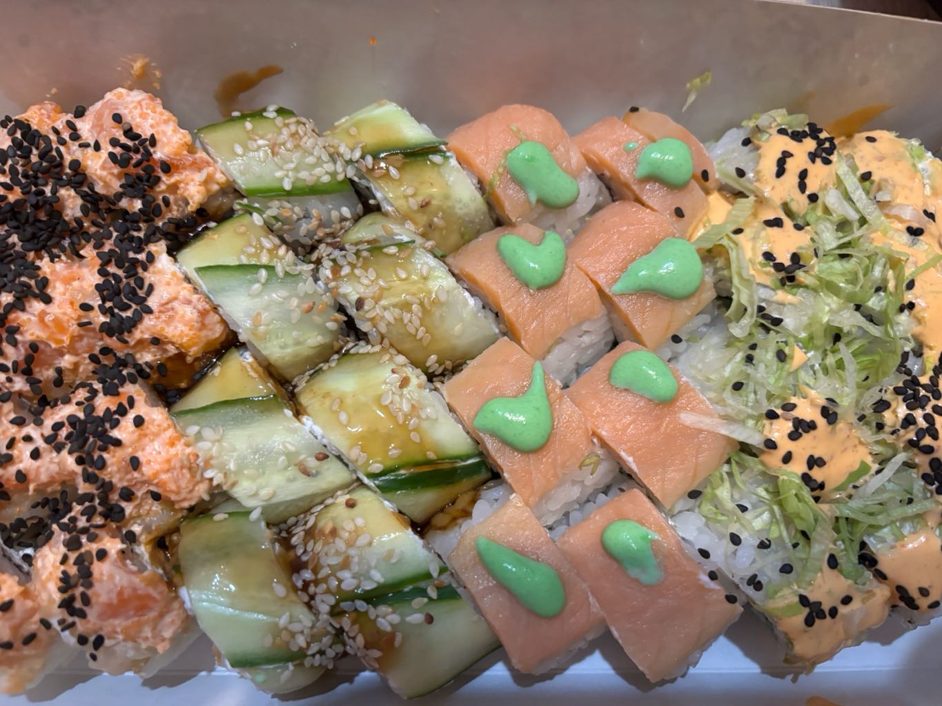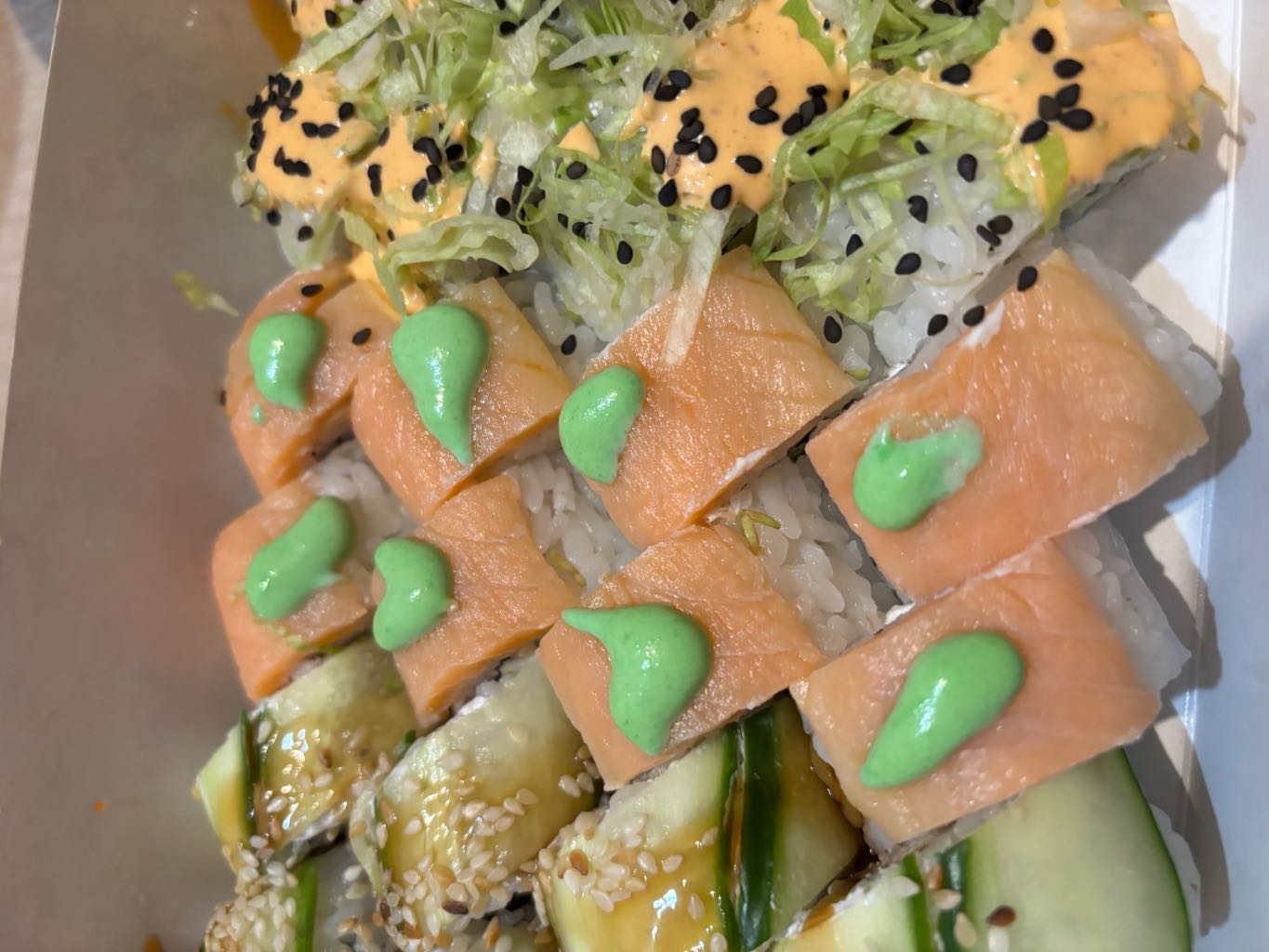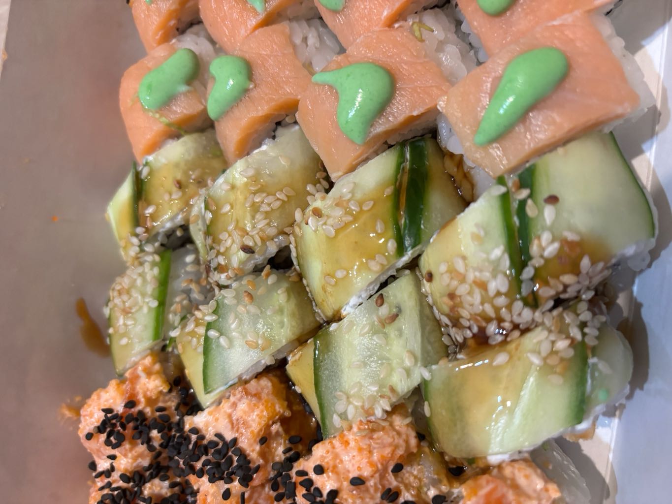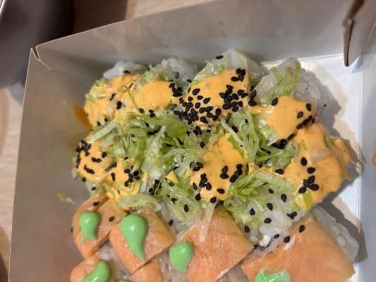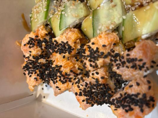 Состав: лосось, огурец, сливочный сыр, соус спайси, кунжут кимчи, соус терияки, кляр, сухари панко