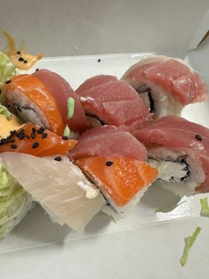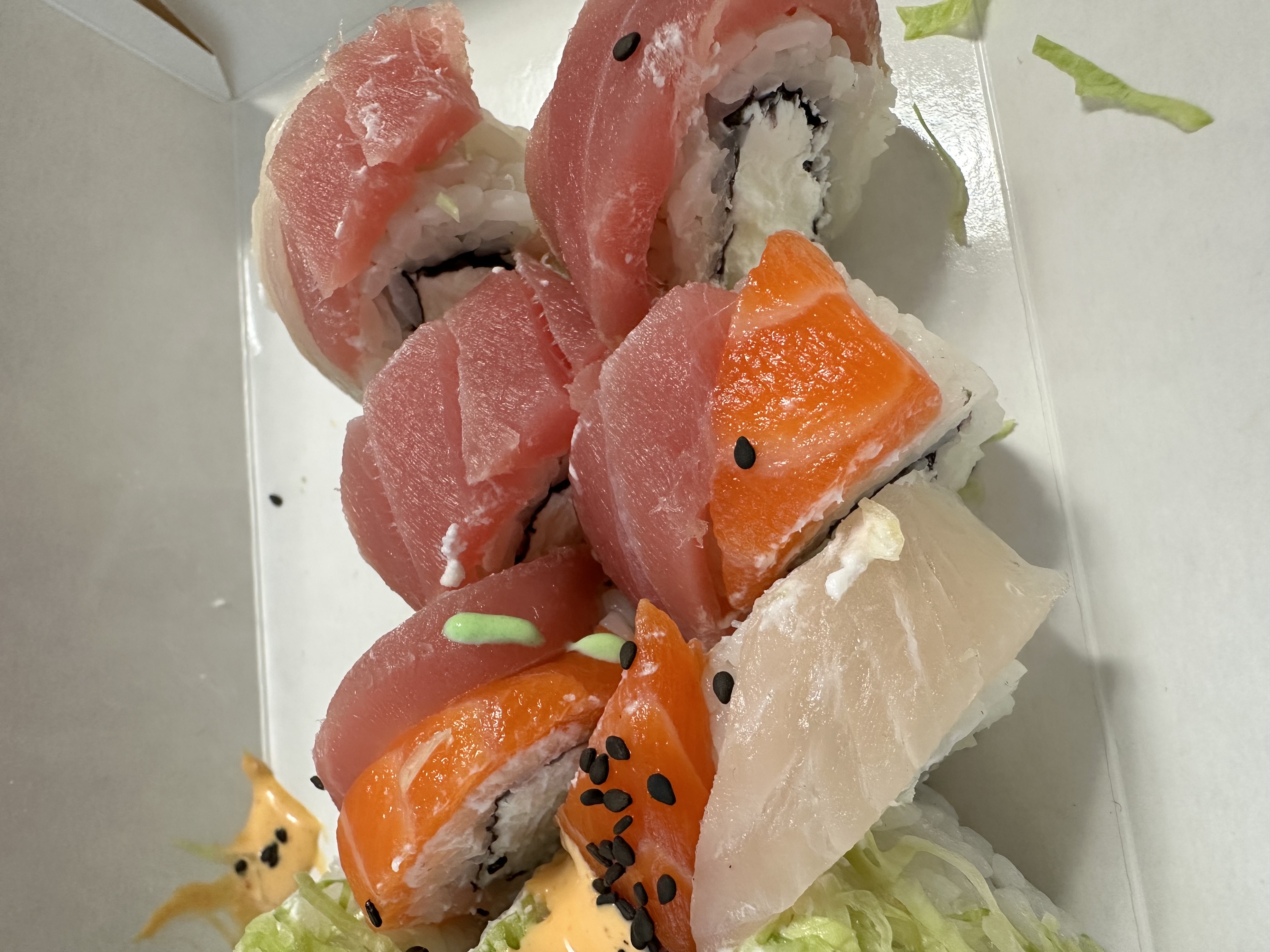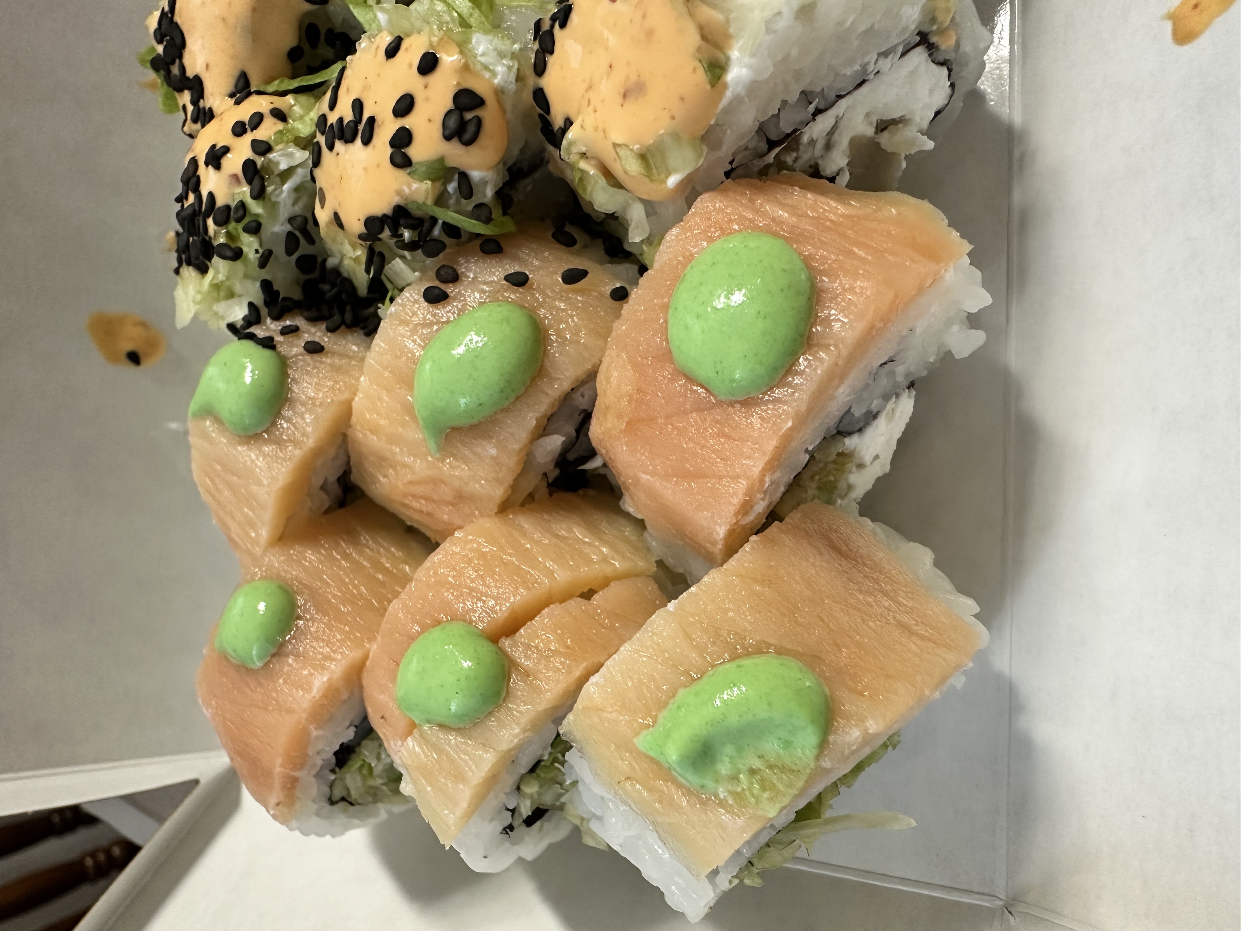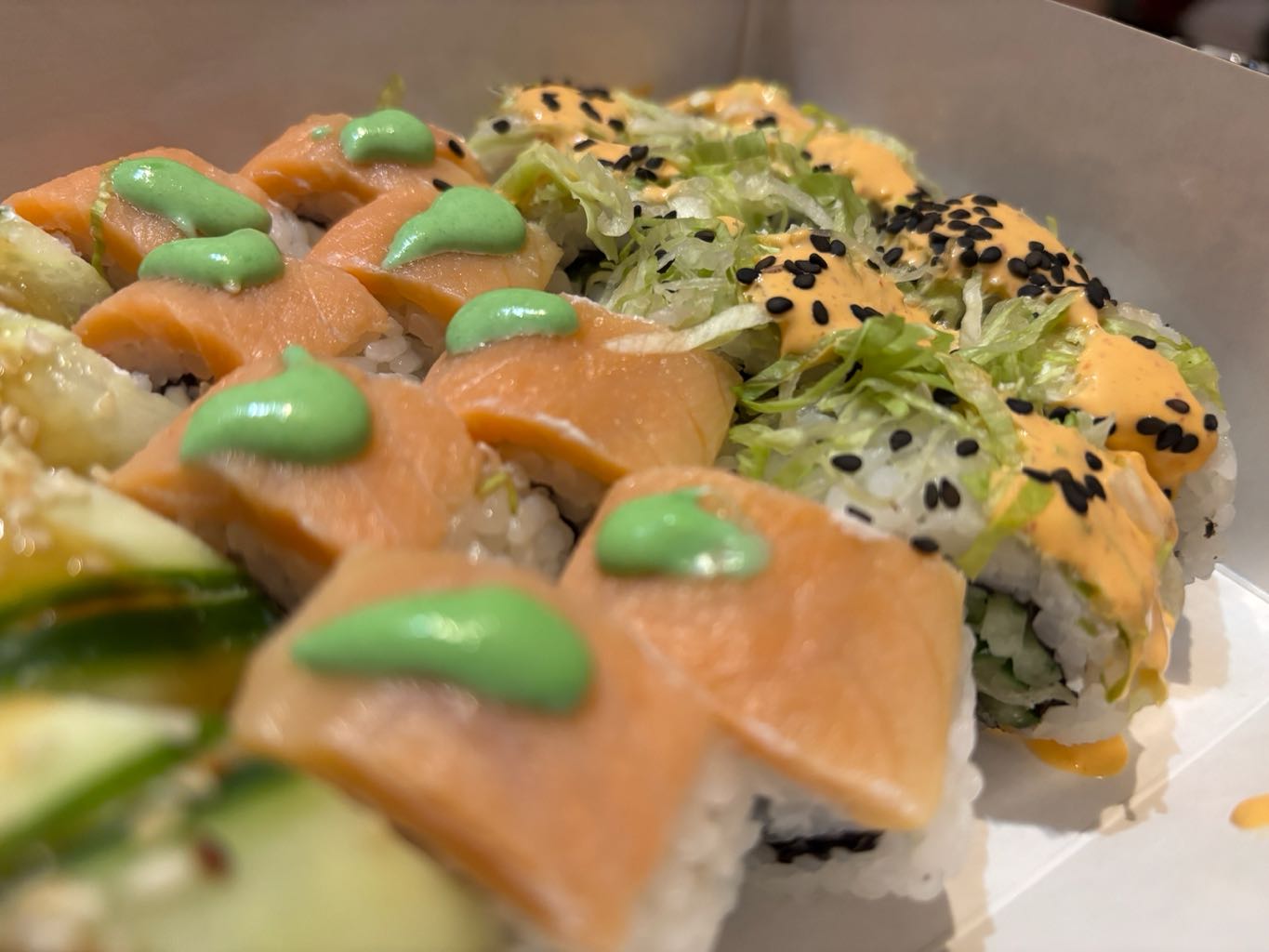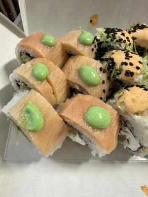 Состав: лосось, огурец, сливочный сыр, соус спайси, кунжут кимчи, соус терияки, кляр, сухари панко