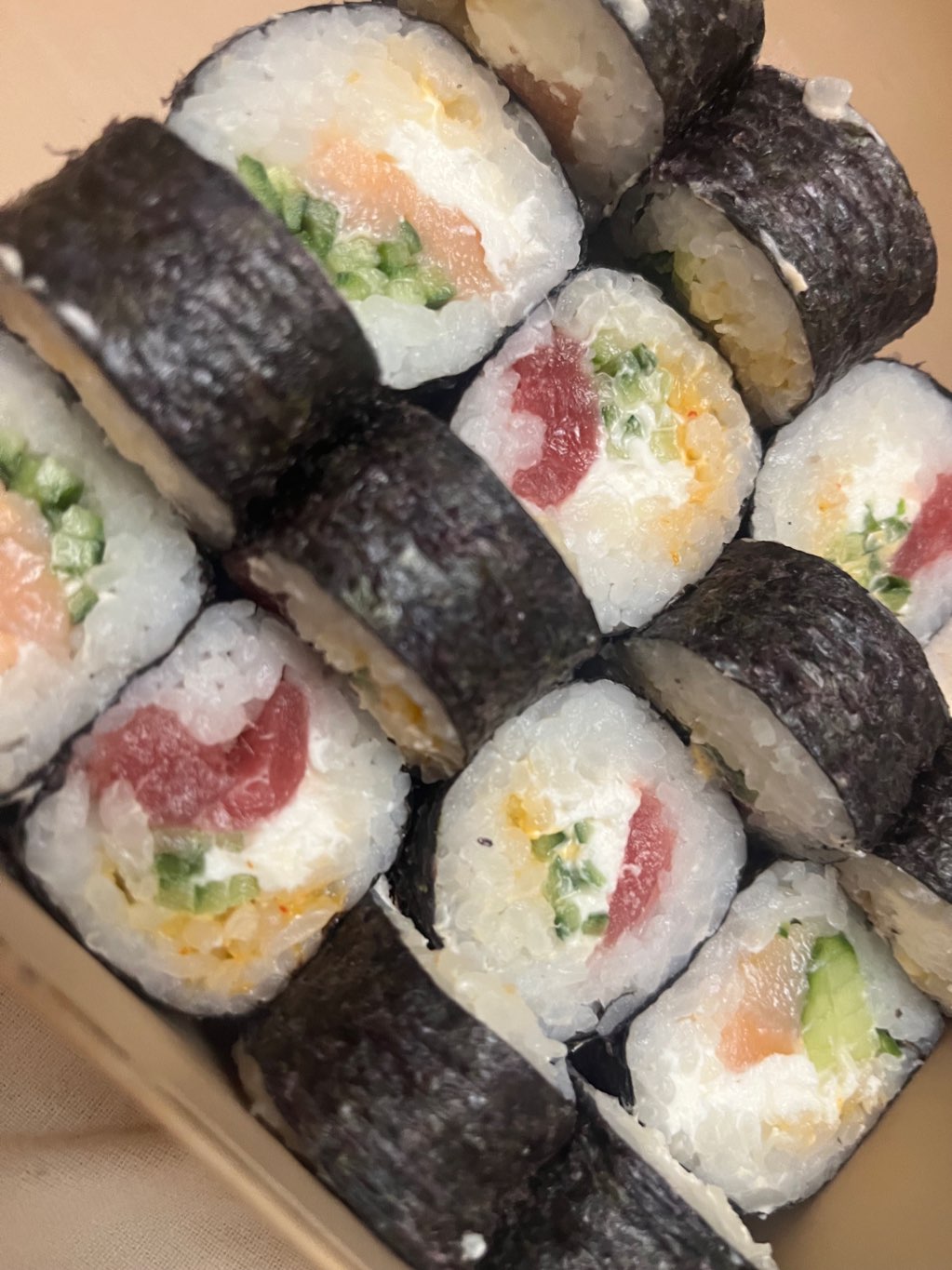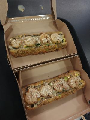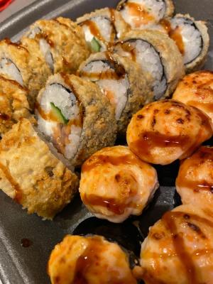 Состав: лосось, огурец, сливочный сыр, соус спайси, кунжут кимчи, соус терияки, кляр, сухари панко