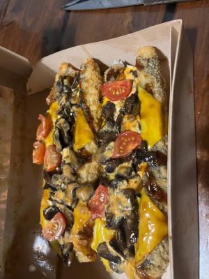 Состав: шампиньоны жаренные, сыр чеддер, кранч лук, сливочный сыр, томаты черри, соус спайси, соус терияки, кляр, сухари панко