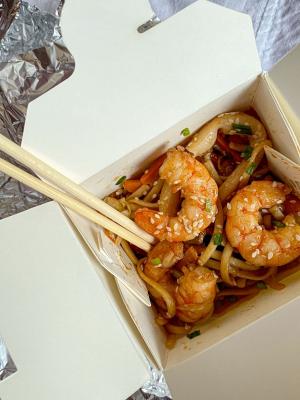 Состав: курица, креветка, морковь, лук, цукини, перец свежий, кукуруза мини, имбирь, чеснок, соус устричный, бульон вок, лапша пшеничная, ростки соевые, кунжут
