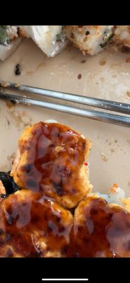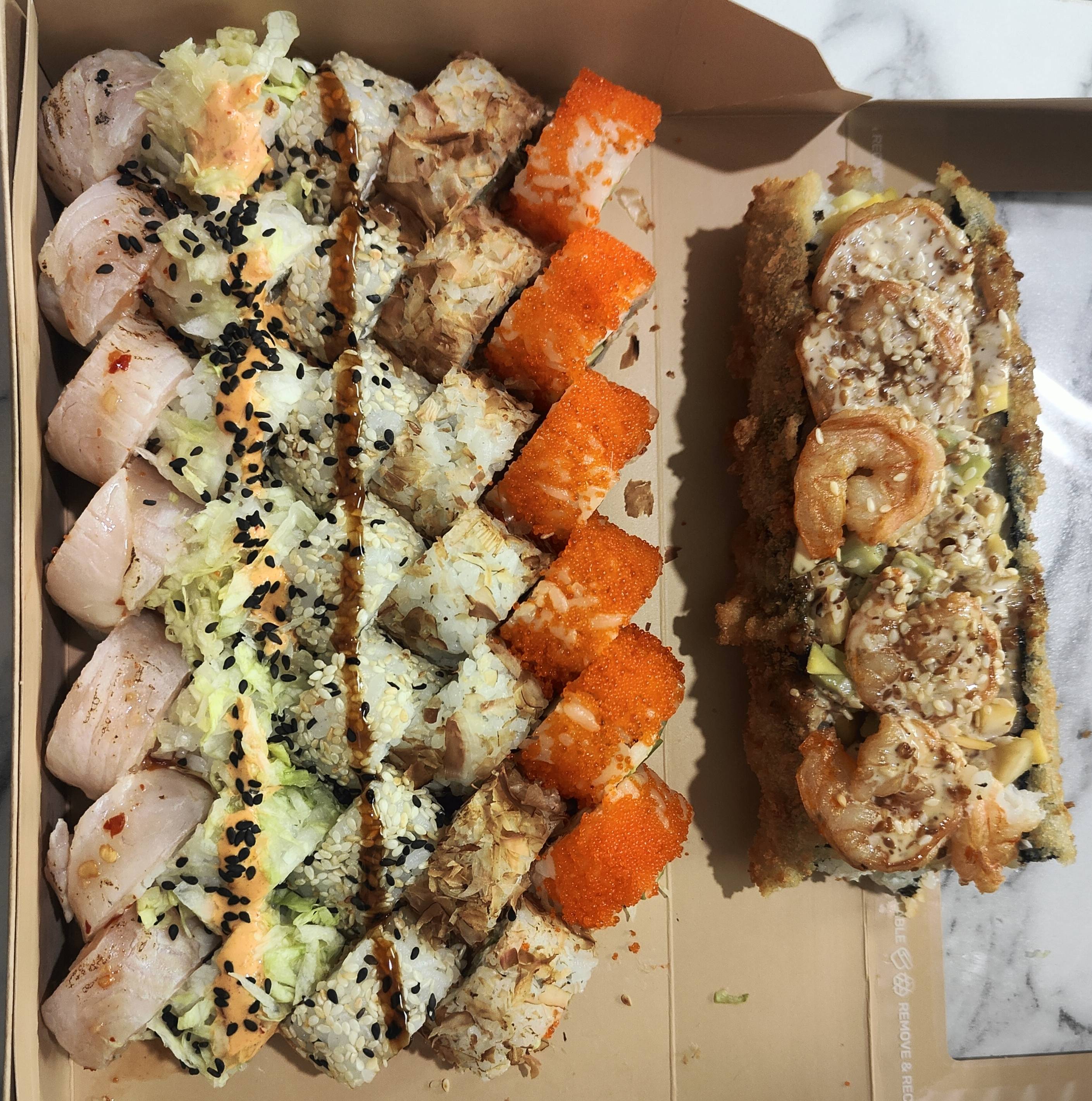 Состав: лосось, огурец, сливочный сыр, соус спайси, кунжут кимчи, соус терияки, кляр, сухари панко