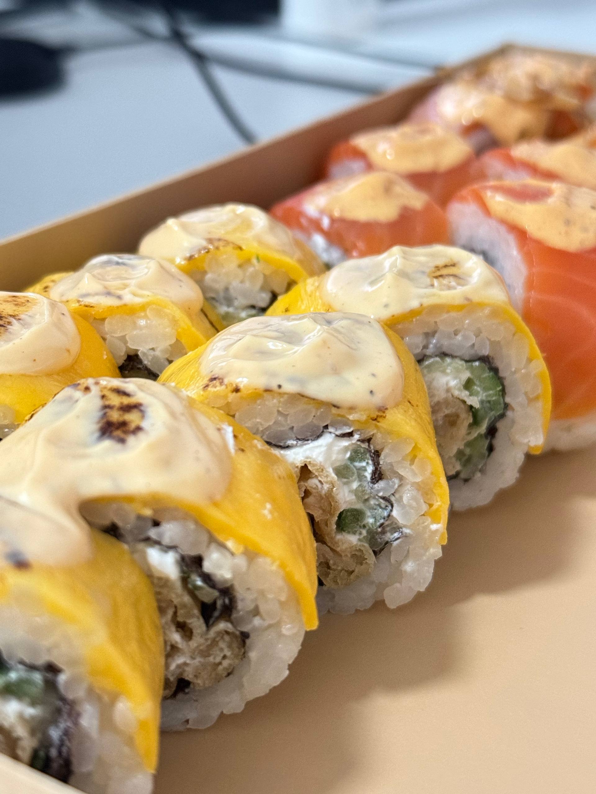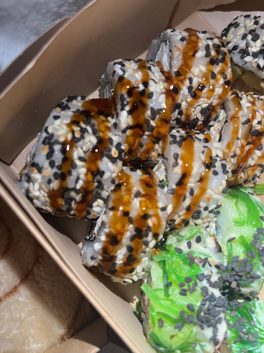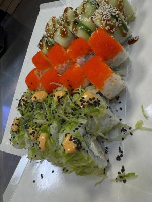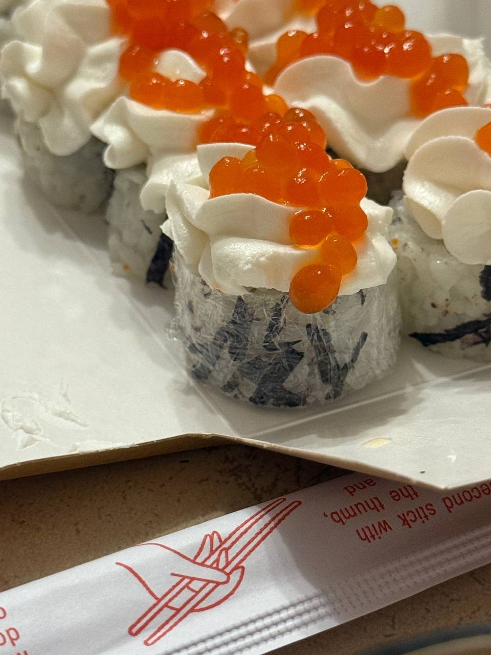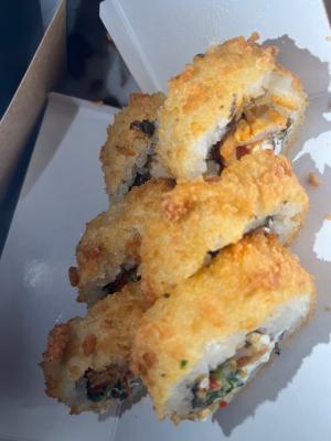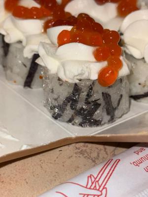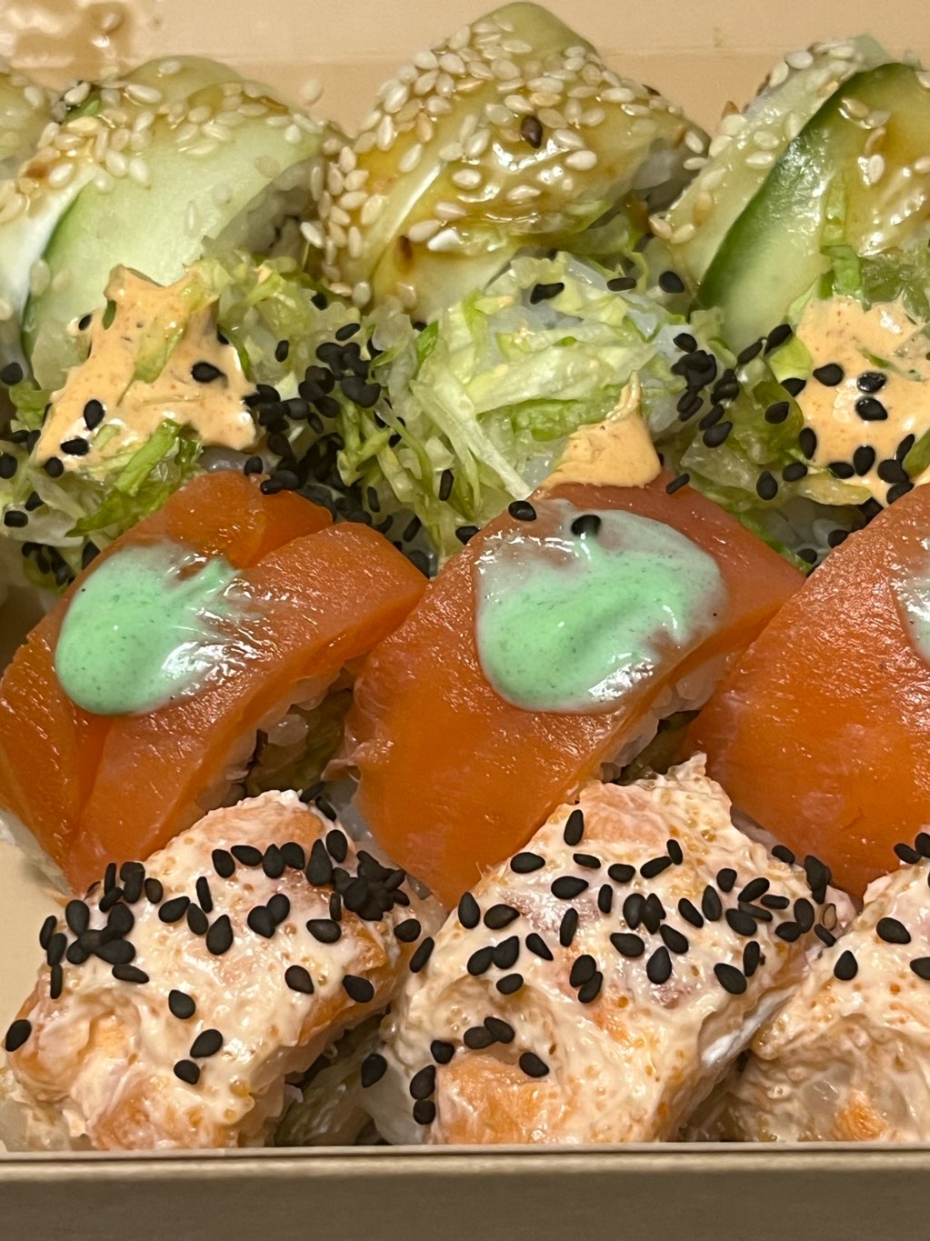 Состав: лосось, огурец, сливочный сыр, соус спайси, кунжут кимчи, соус терияки, кляр, сухари панко