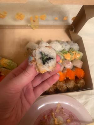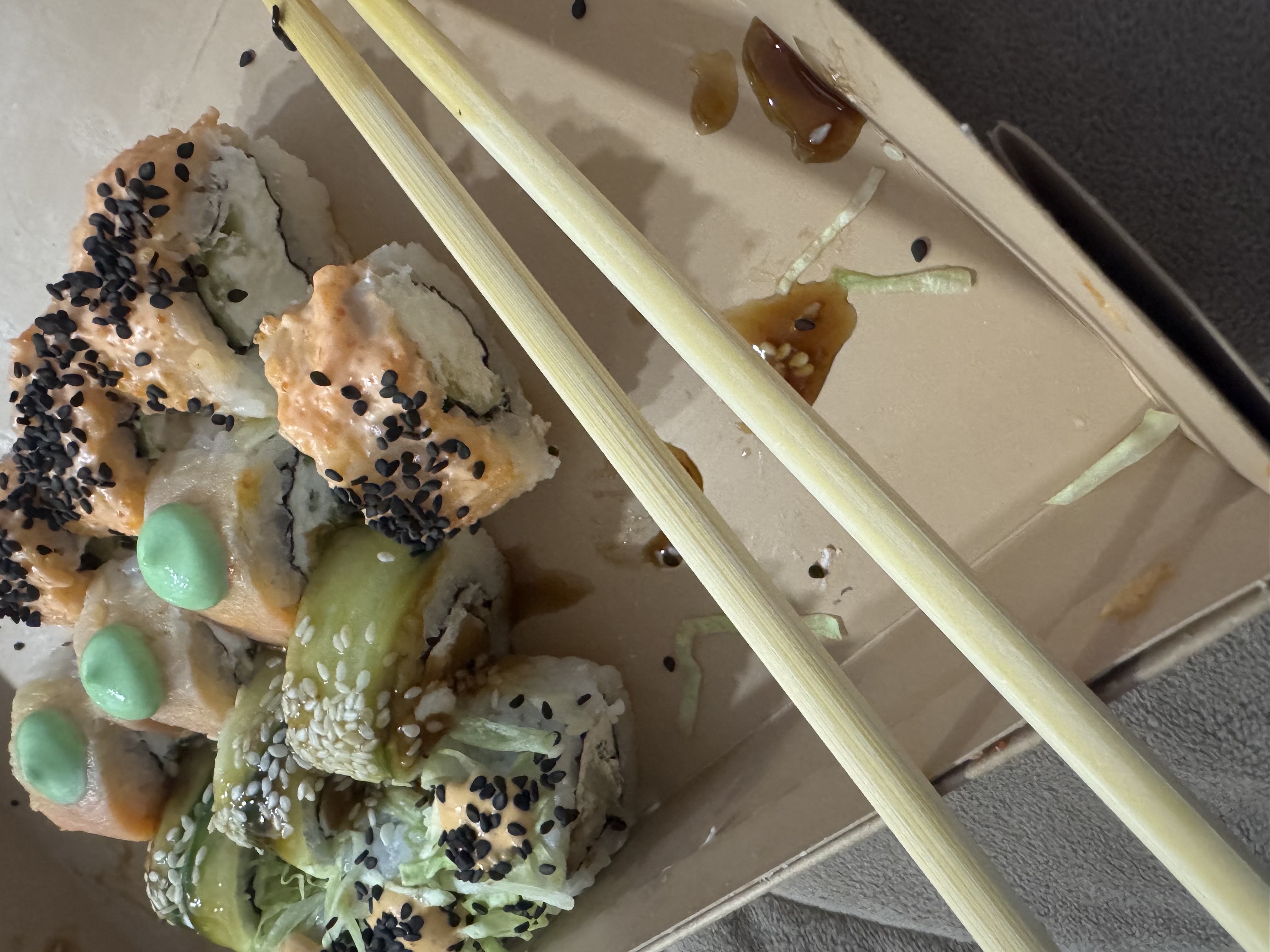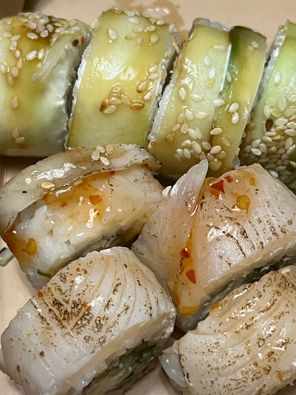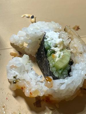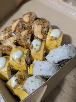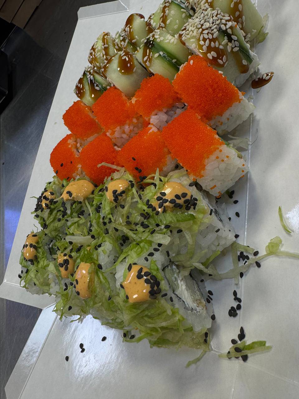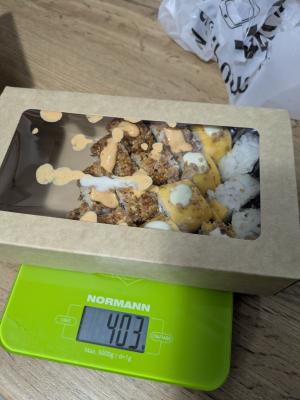 Состав: лосось, огурец, сливочный сыр, соус спайси, кунжут кимчи, соус терияки, кляр, сухари панко