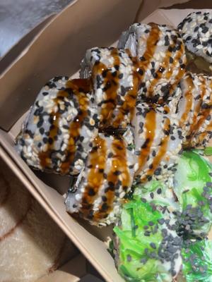 Состав: краб микс, сыр чеддер, огурец, чипс бекона, сливочный сыр, соус терияки, кляр, сухари панко