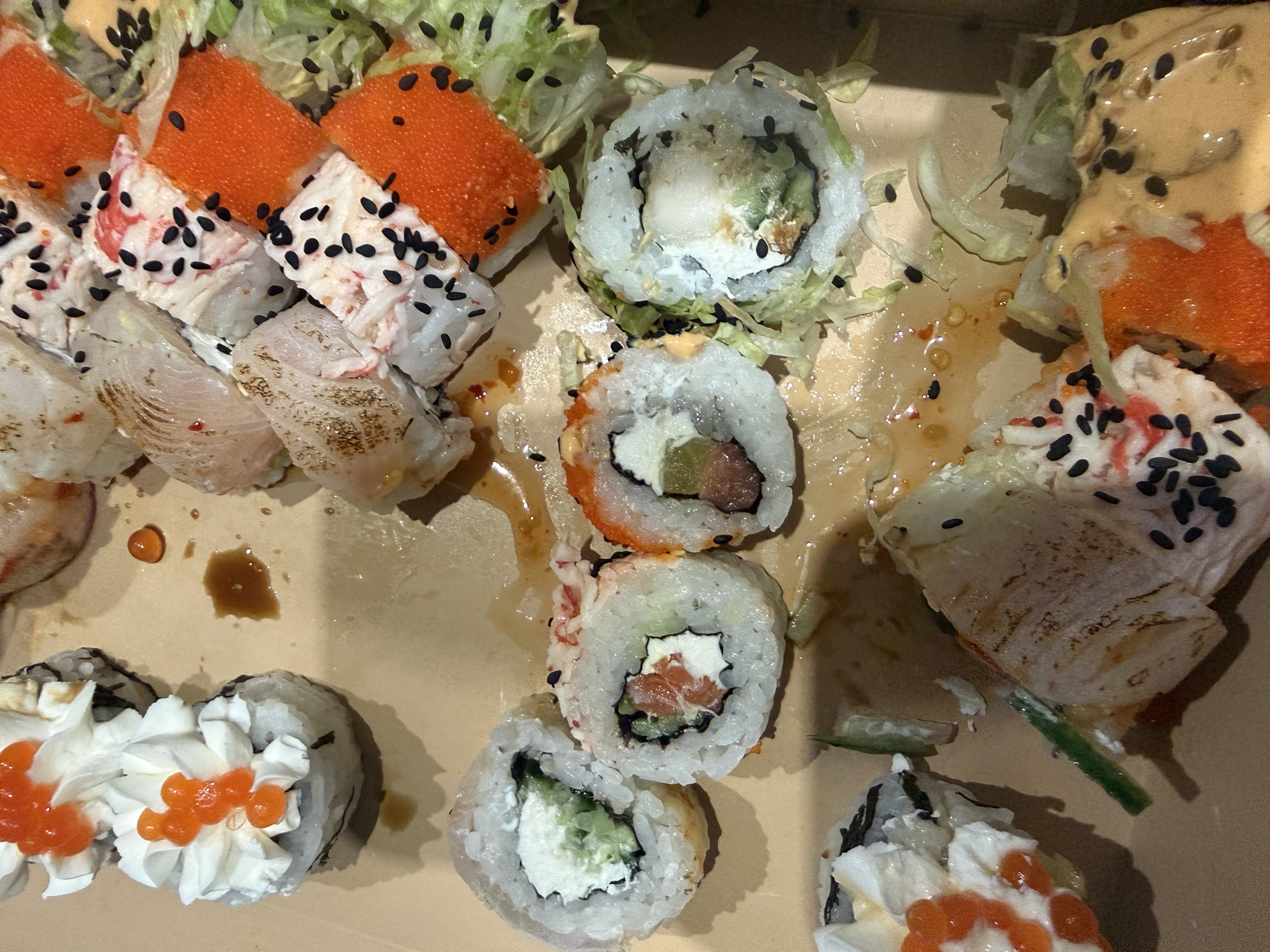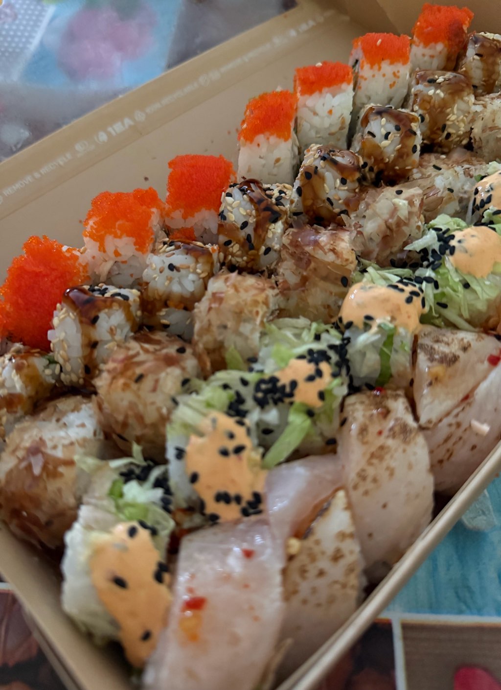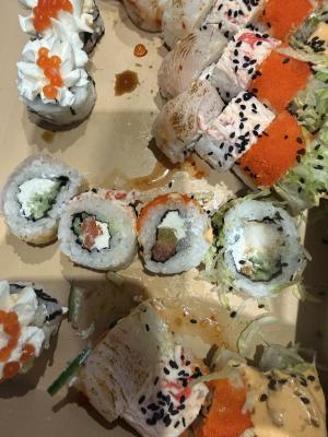 Состав: лосось, огурец, сливочный сыр, соус спайси, кунжут кимчи, соус терияки, кляр, сухари панко