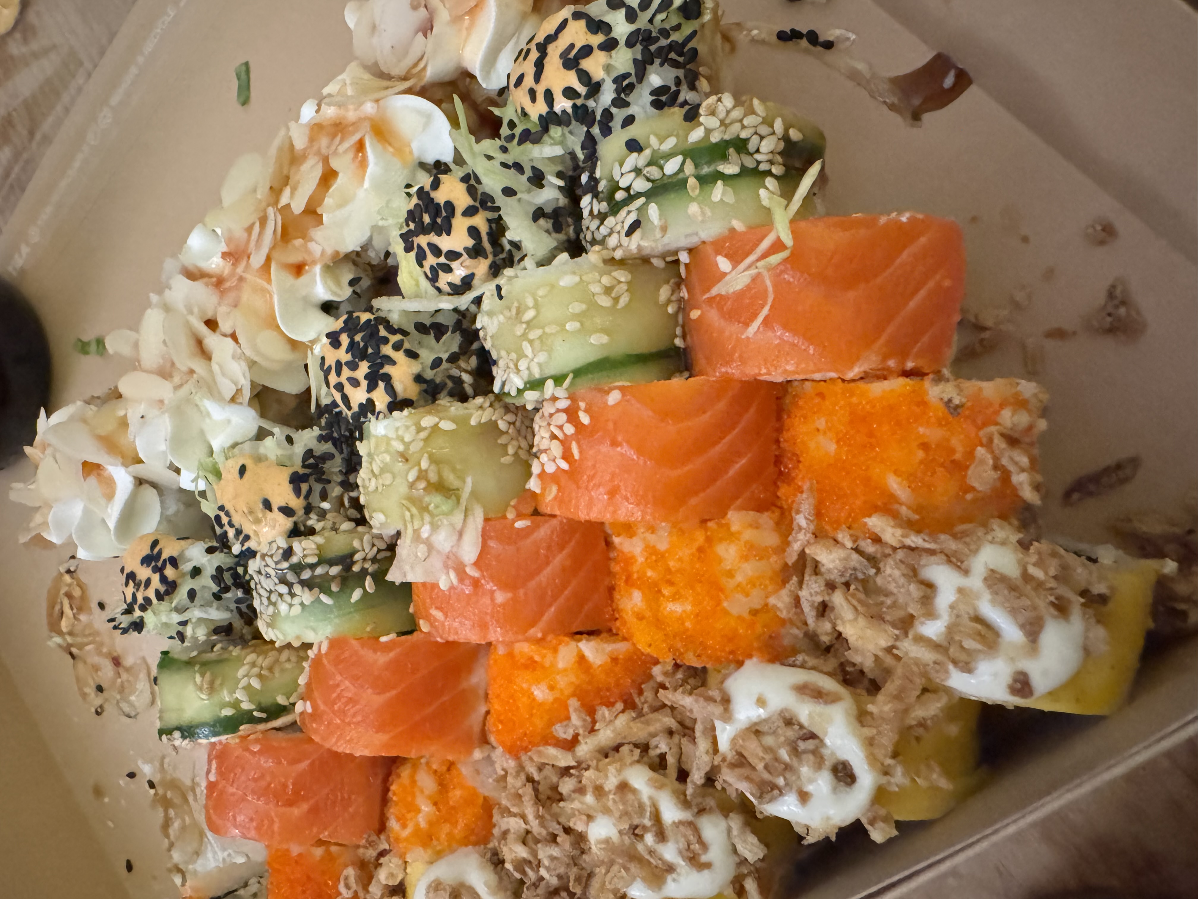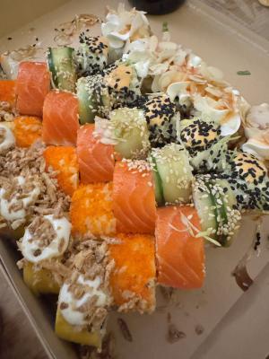 Состав: лосось, огурец, сливочный сыр, соус спайси, кунжут кимчи, соус терияки, кляр, сухари панко