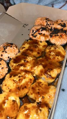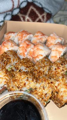 Состав: лосось, огурец, сливочный сыр, соус спайси, кунжут кимчи, соус терияки, кляр, сухари панко