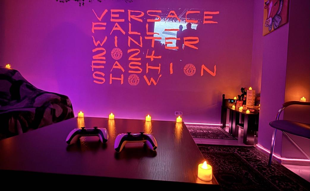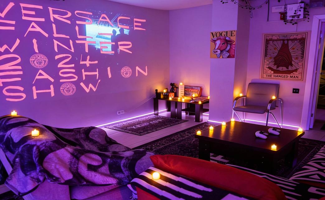В приватном киноруме вас ждет уютная атмосфера: мягкие диваны и пуфики, стильные столы и приятное неоновое освещение, создающие комфортную обстановку для просмотра фильмов и игр.