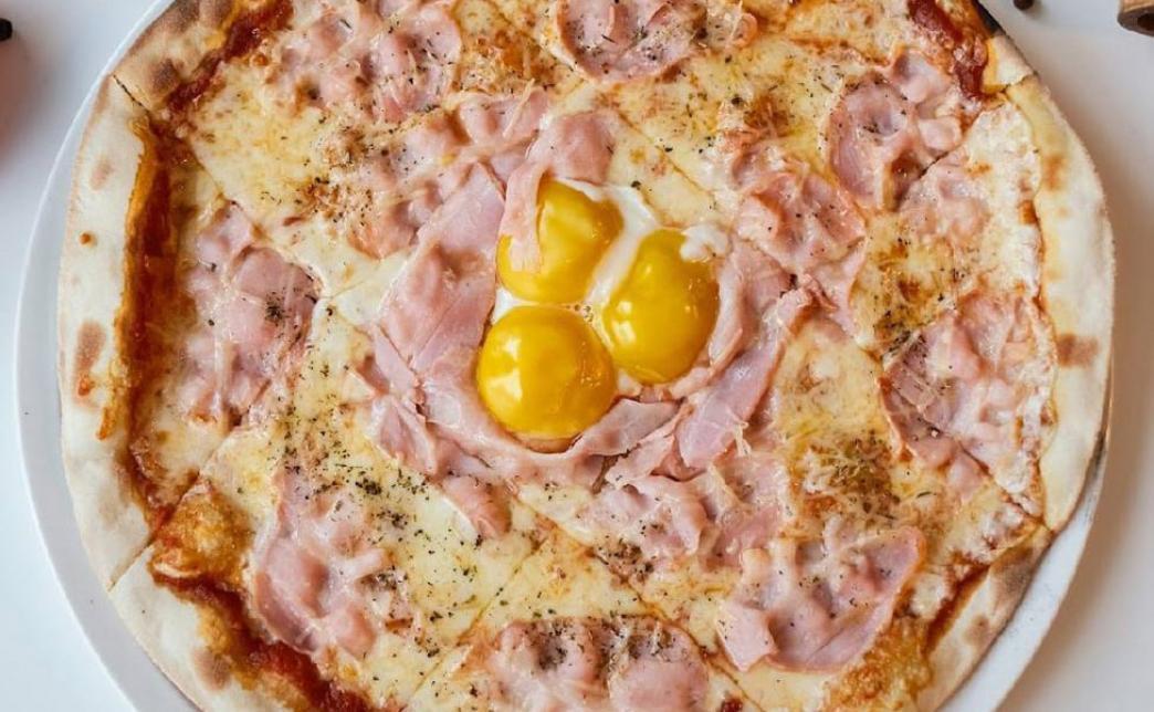 - пицца "Карбонара" (530 г): тесто, соус авторский из томатов, бекон, сыр моцарелла, яйцо куриное