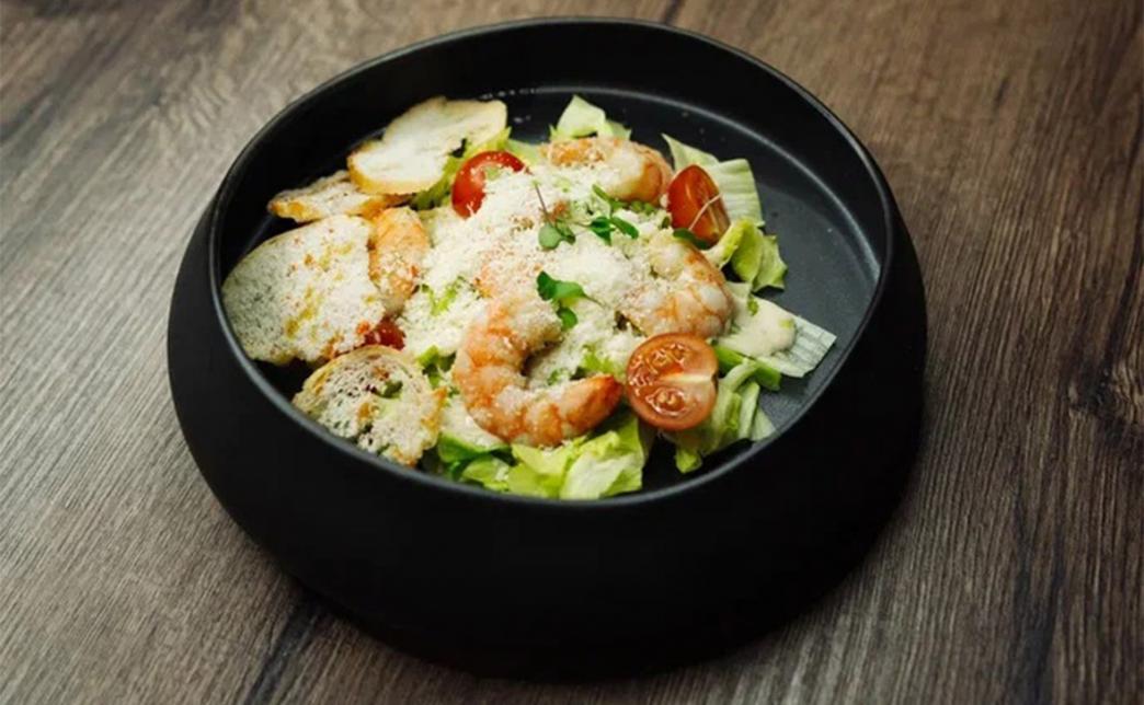 Состав: булочка, салат, томат, креветки, маринованный лук, соус цезарь, соус васаби-лайм