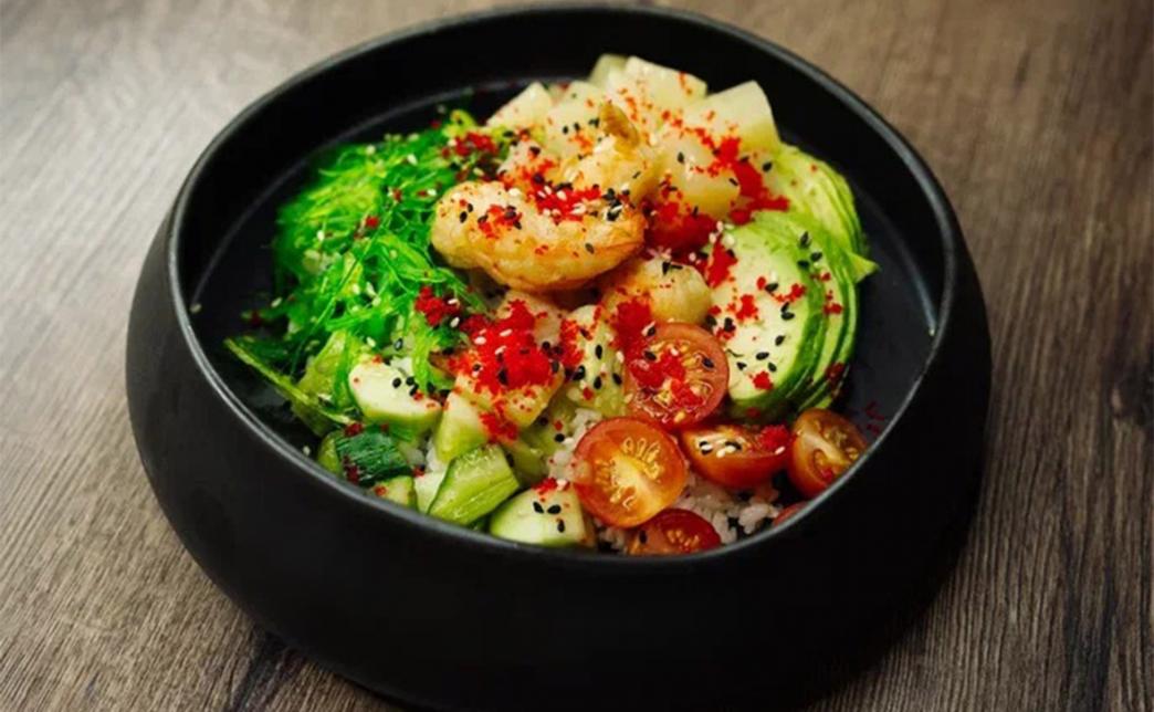 Состав: рис, нори, креветка темпура, форель, огурец, икра тобико, цедра апельсина, свит чили