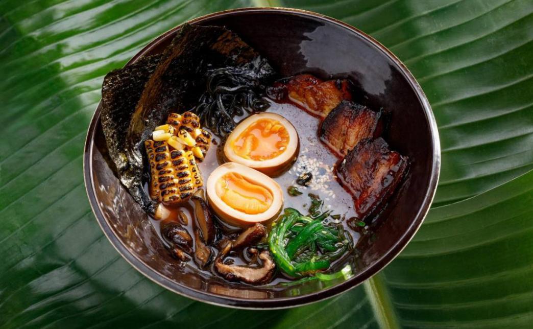 Состав: плотный куриный бульон с чесночным маслом, свинина в соусе кочуджан, черная пшеничная лапша ручной работы, кукуруза, обжаренные грибы, чука, яйцо, кунжут, чили масло