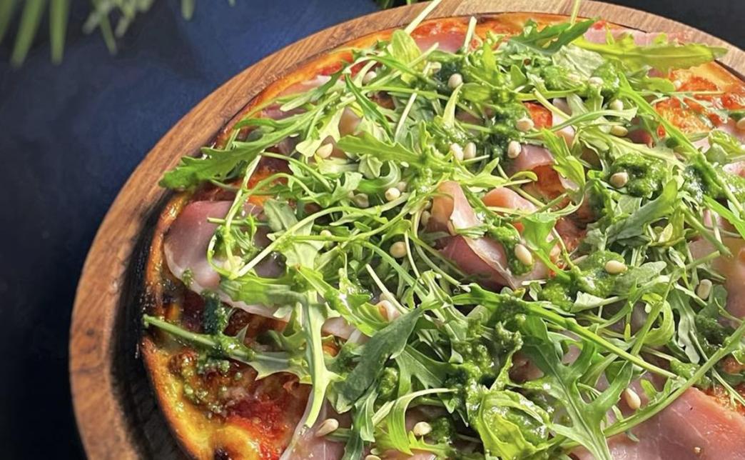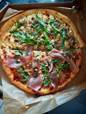 "С прошутто и соусом песто" (605 г) 28 р. Состав: тесто, соус для пиццы, моцарелла, парма, руккола, соус песто, орех кедровый, базилик сухой, масло ароматное