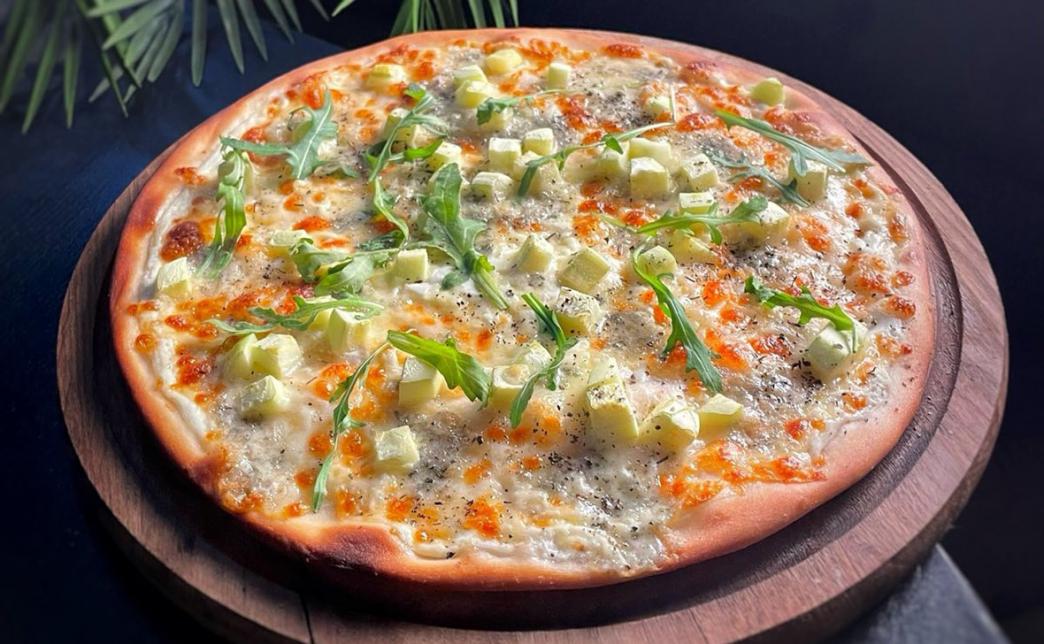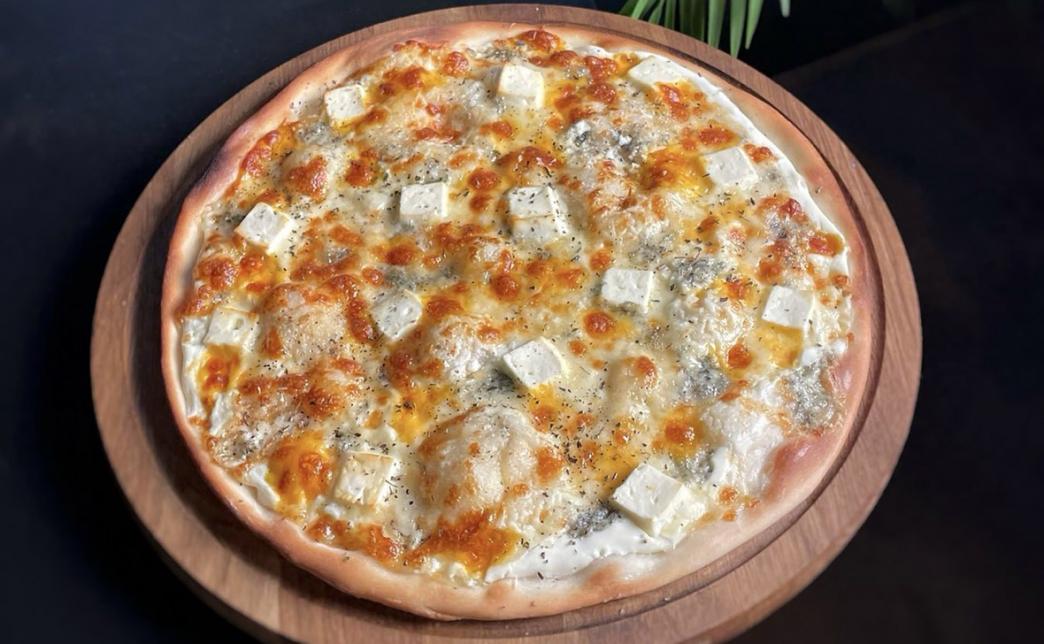 "5 сыров" (620 г) 28 р. Состав: тесто для пиццы, сметана, моцарелла, пармезан, фета, горгонзола, чеддер, базилик сухой, масло ароматное