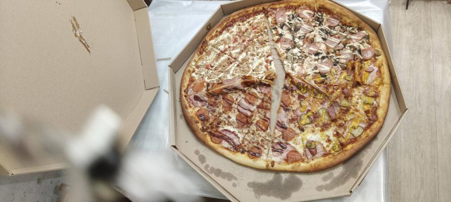 - мега-пицца "Компанейская" (60 см, 2000 г): моцарелла, пицца-соус, помидор, ветчина куриная, пепперони, бекон, лук маринованный, колбаски охотничьи, огурцы маринованные