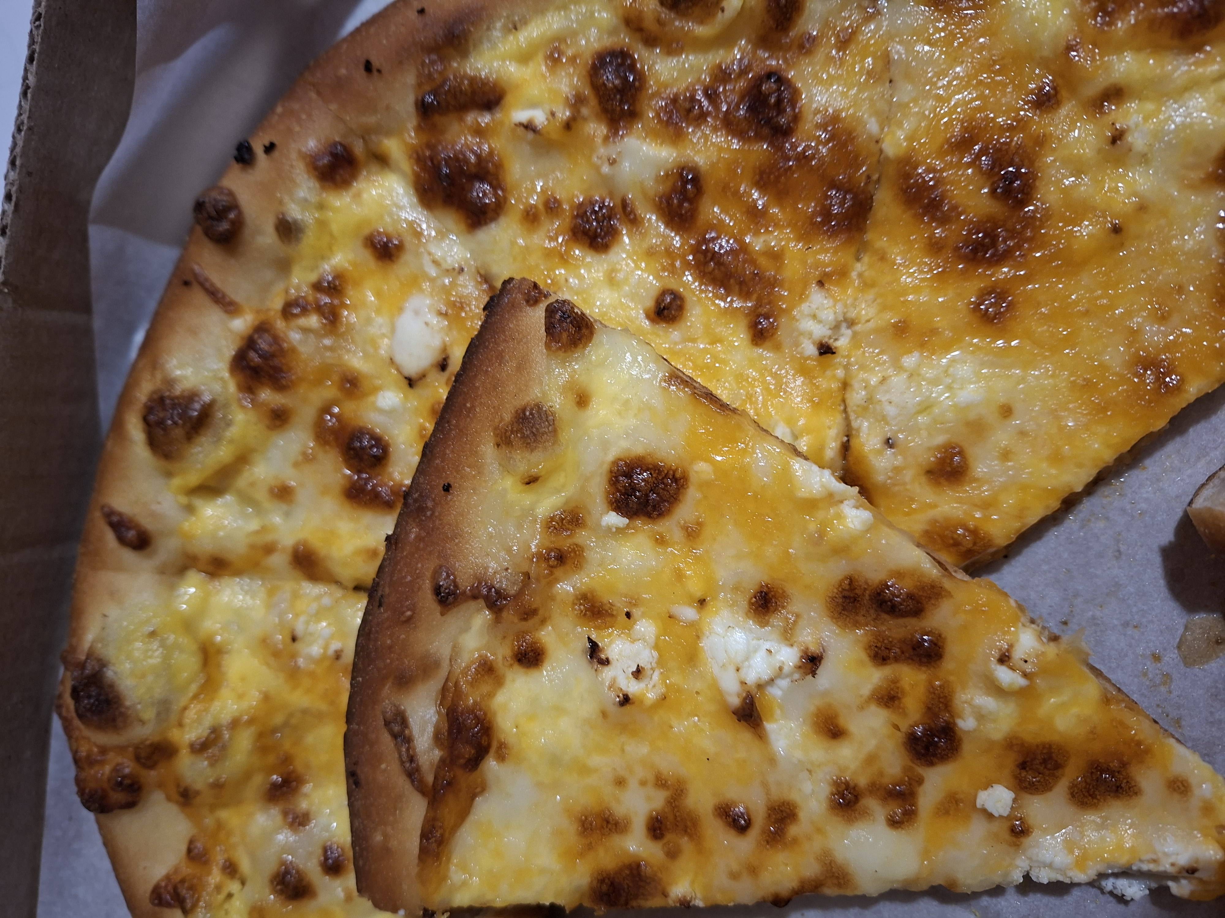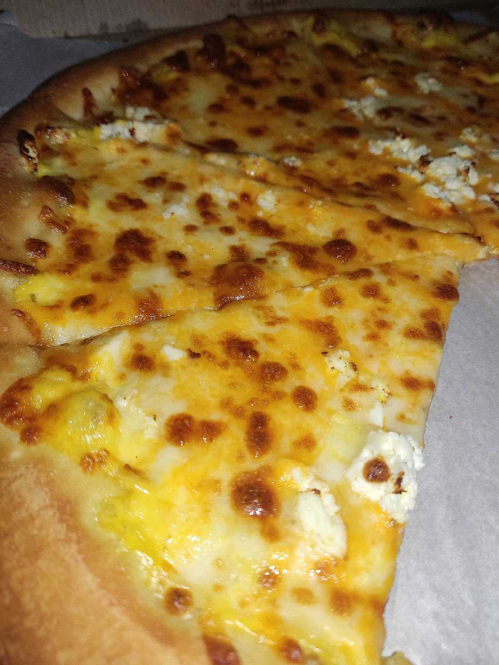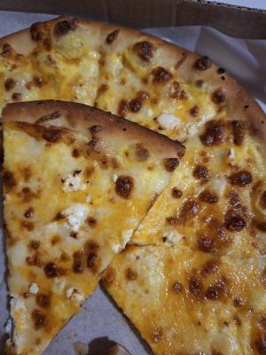 Состав: моцарелла, чесночный соус, кетчуп, ветчина, грибы, пепперони, филе цыпленка рубленое, томат, фета
