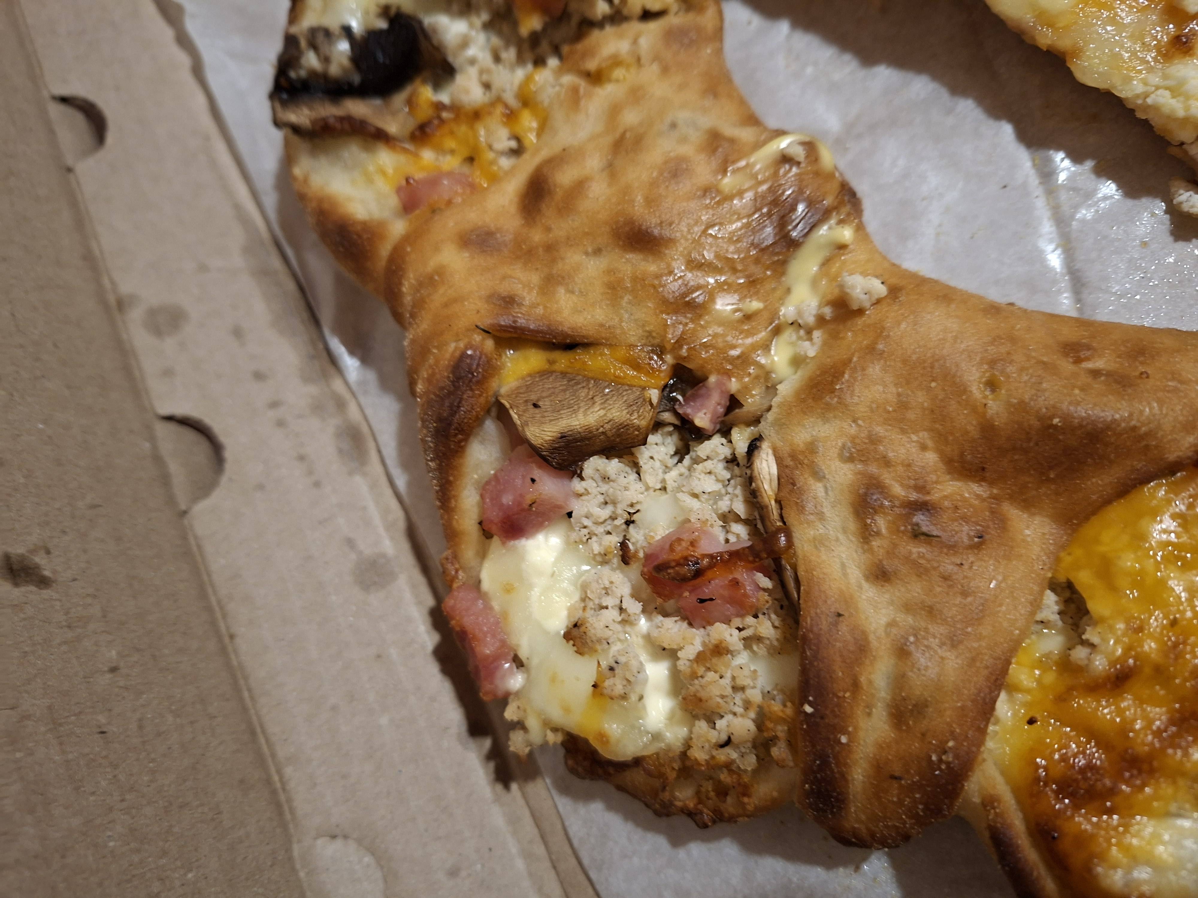 Состав: моцарелла, пицца-соус, ветчина, бекон, томат, огурец маринованный, чеддер, соус бургер