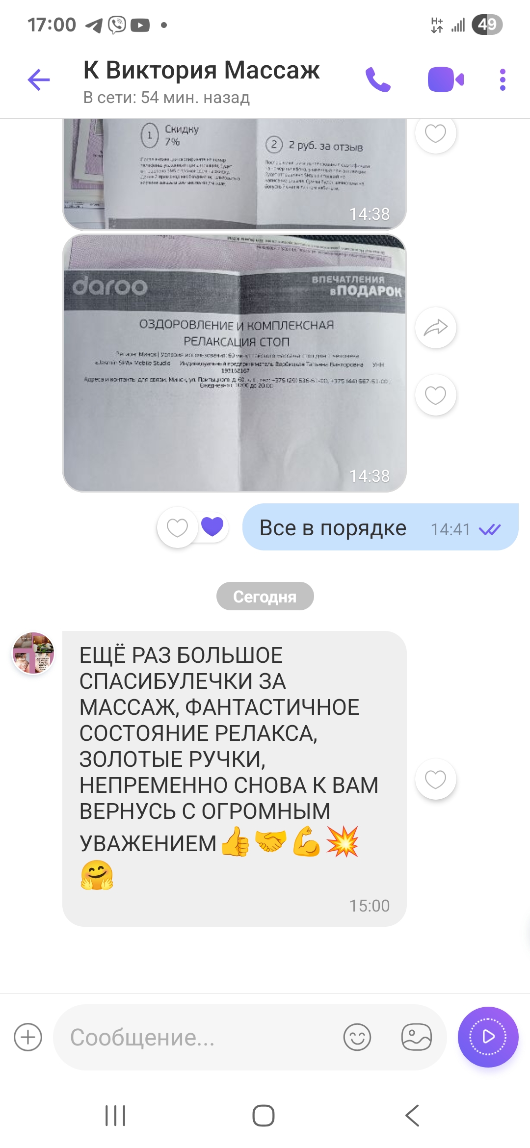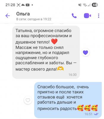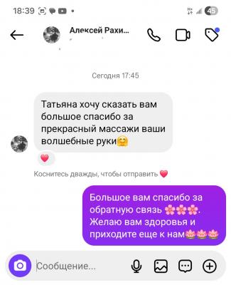 Делала массаж с камнями у Татьяны. Всё очень понравилось! Массаж согревающий и очень расслабляющий. Успела даже уснуть. Татьяна настолько располагает к себе, что хочется повторить! Спасибо за чудесный массаж! Всем рекомендую!