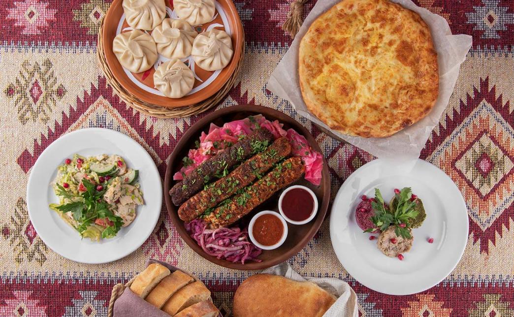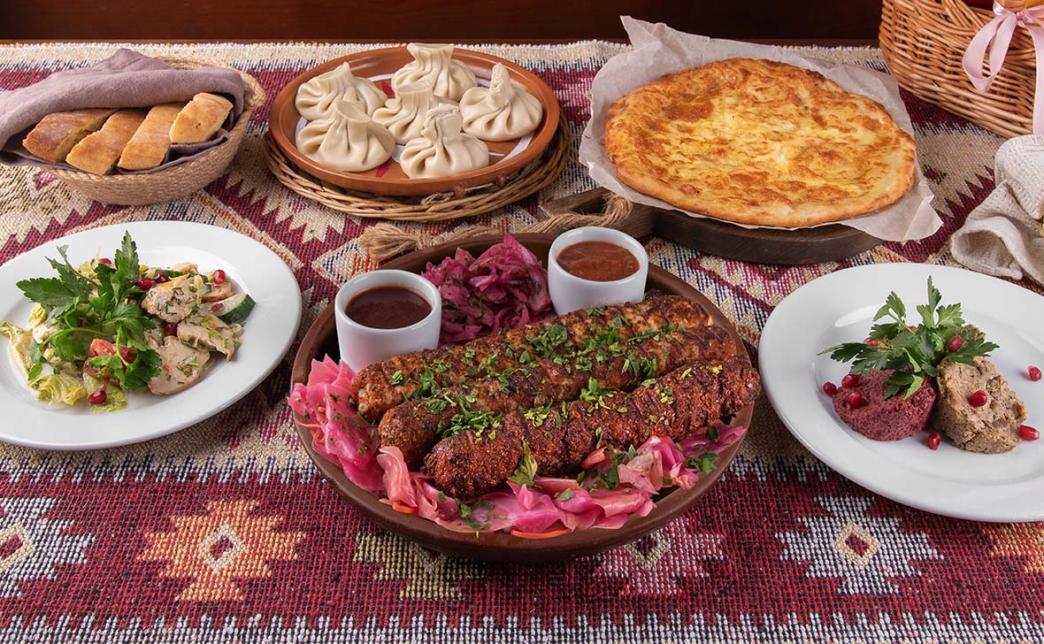 - тарелка кебабов (540 г): кебабы из свинины, курицы и говядины с капустой по-гурийски, маринованным луком и зеленью, с соусами сацебели и ткемали