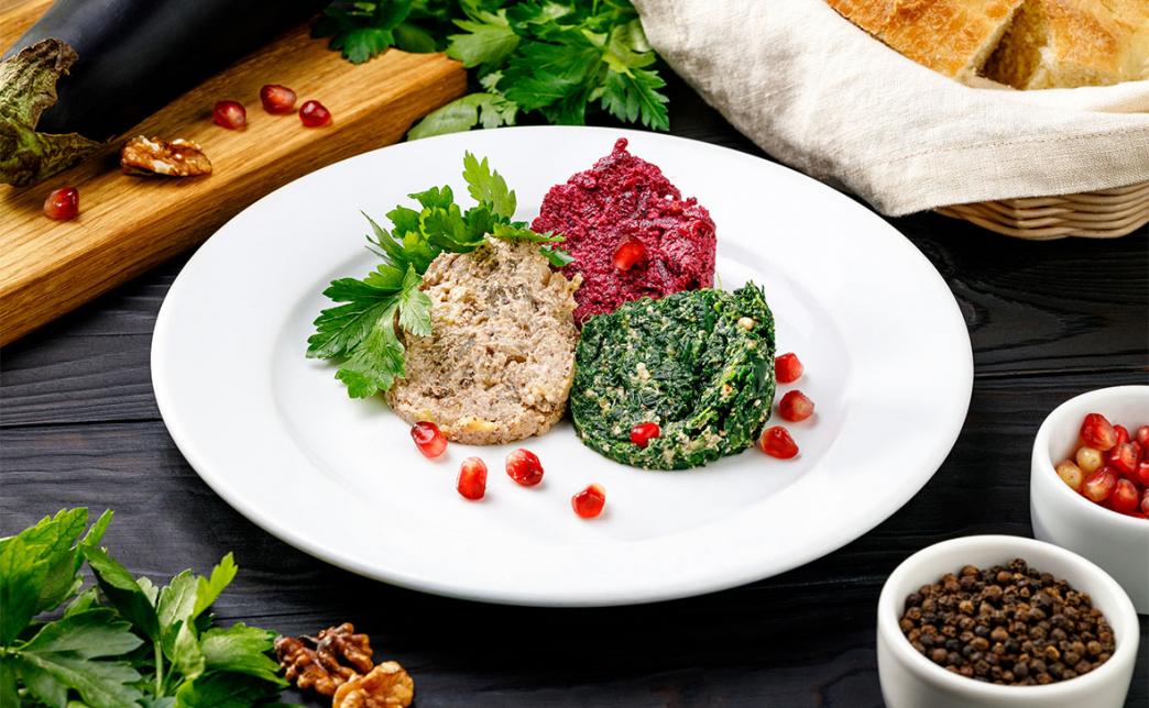 - "Трио пхали" (150 г): пряная ореховая паста со шпинатом, свеклой, баклажаном