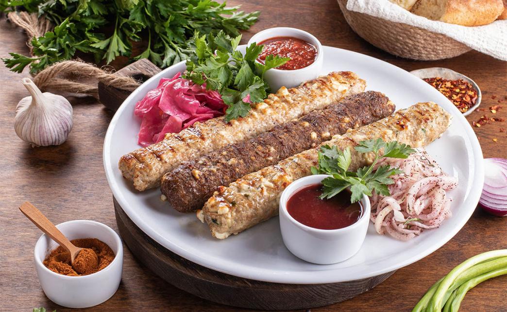 - тарелка на мангале (730 г): люля-кебаб из говядины, шашлык из свинины и курицы с картофельными дольками и маринованным луком, с соусами сацебели и ткемали