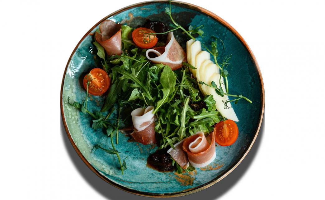- "Легкий салат с пармой и грушей": микс салата, груша карамелизированная, парма, черри, лук карамелизированный, соус песто - 210 г