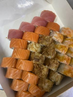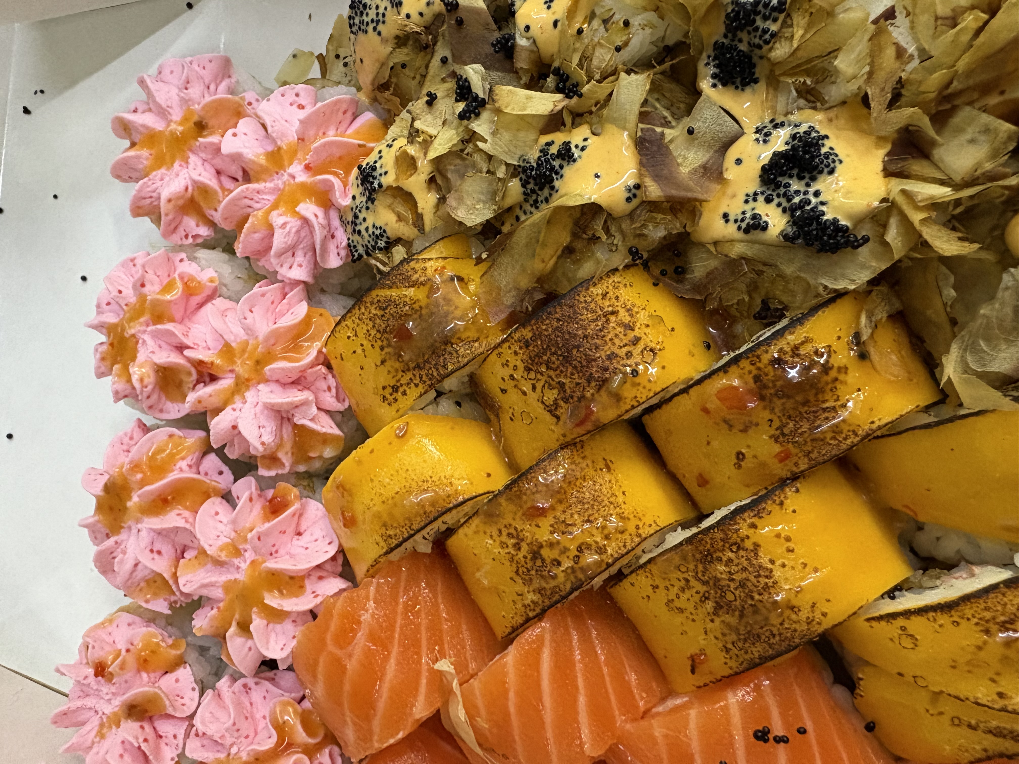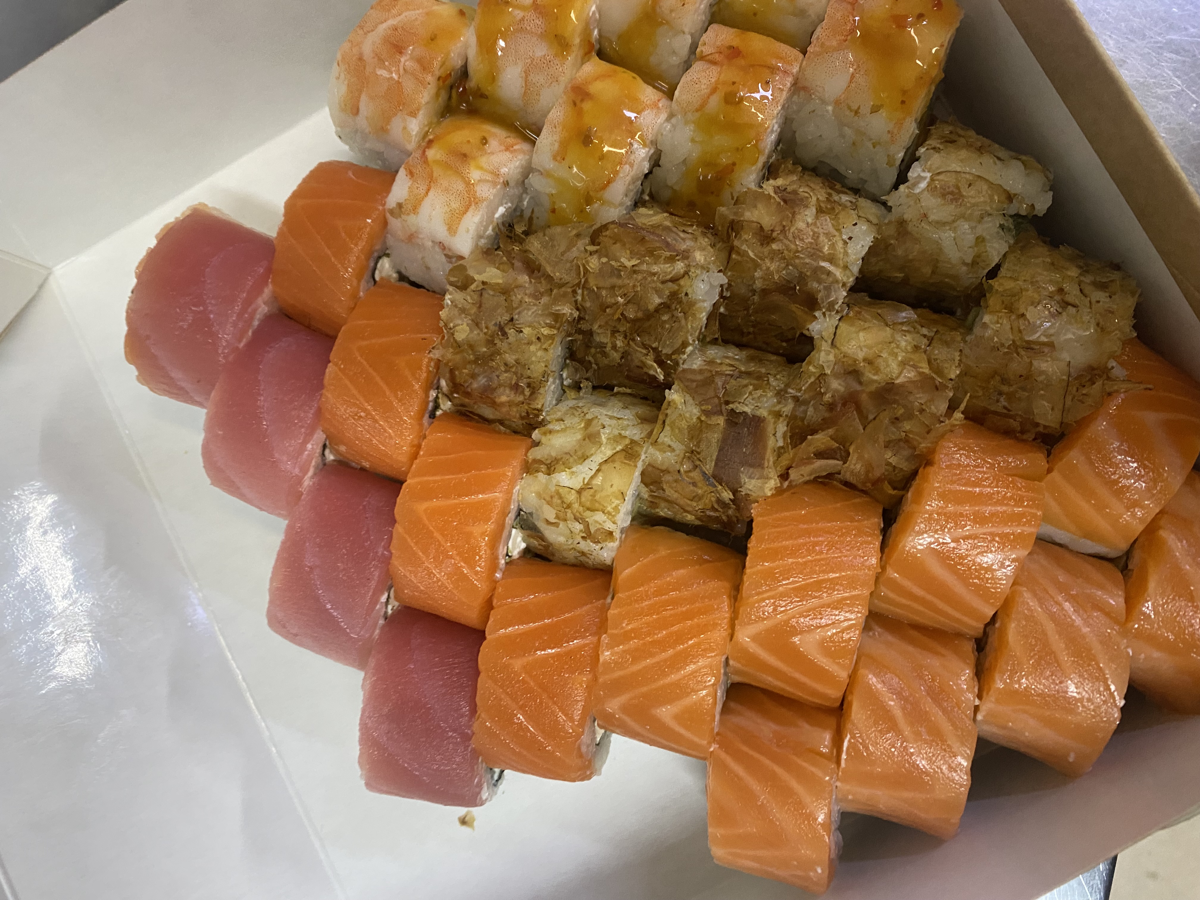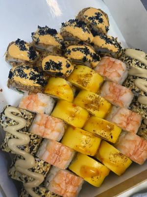 - "Бостон": креветка, сливочный сыр, ананас, салат Айсберг, соус сладко-ореховый, икра Тобико красная. Острое - 8 шт.