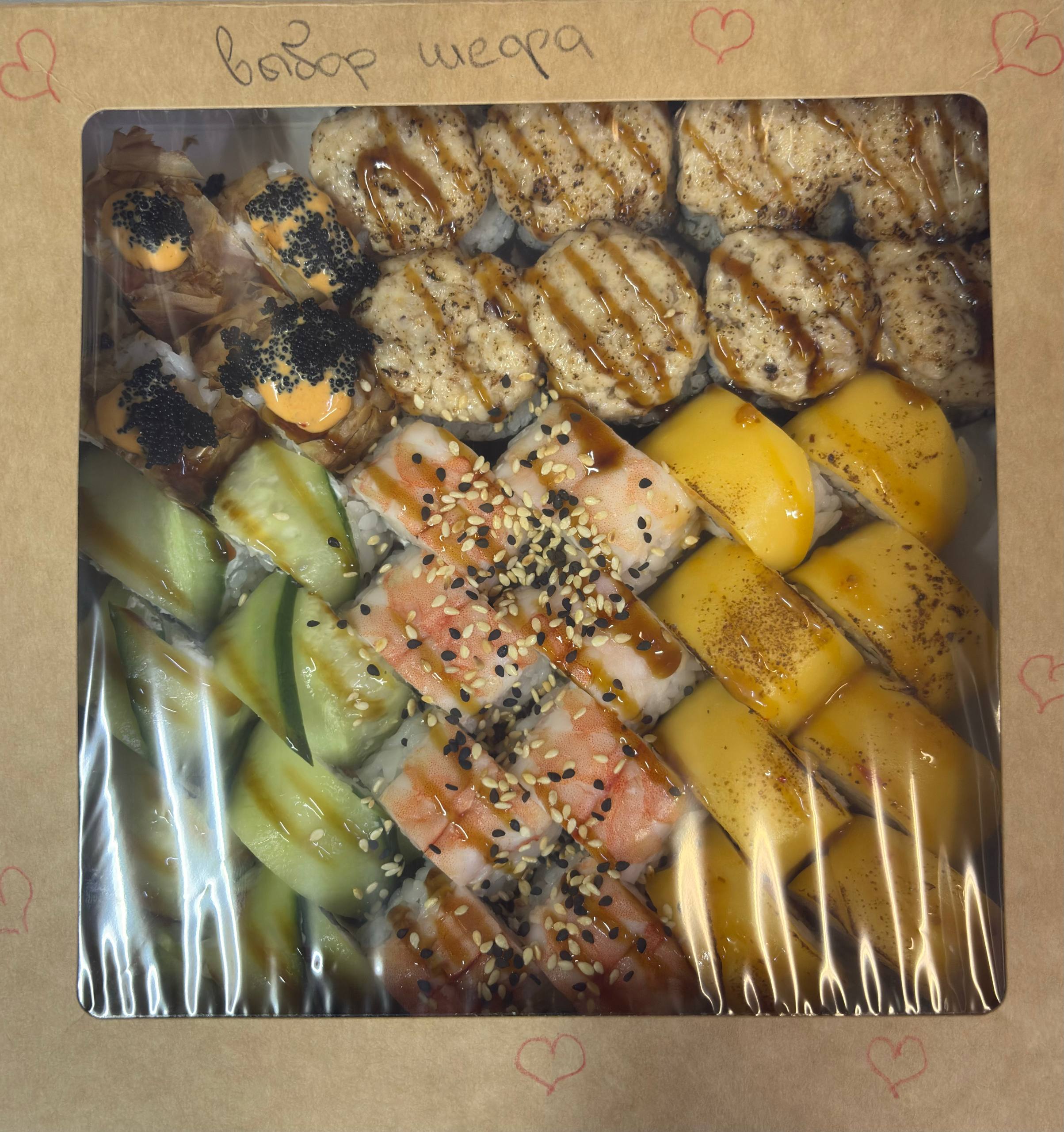 - "Висконсин🌶": креветка, сыр чеддер, пряный соус, соус сладко-ореховый, криспи - 8 шт.