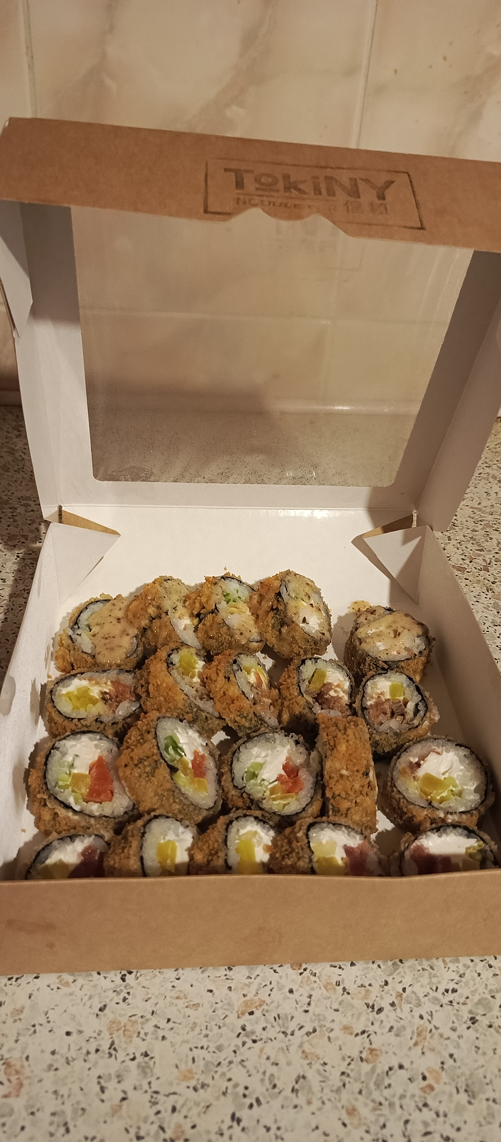 - "Хотсити": жареный морской окунь, сливочный сыр, огурец, омлет тамаго, сырный соус, нори, соус терияки - 8 шт.