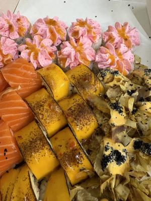 - "Манчестер": жареное филе лосося, такуан, сливочный сыр, омлет тамаго, соус лос-анджелес, кунжут - 8 шт.